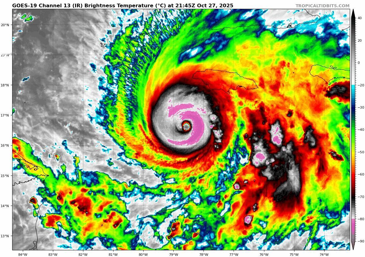 【五级飓风梅丽莎】留存一个五级飓风梅丽莎的云图动画。图1正好是当地日落前后,可见光云图转为红外云图。图2为红外云图。图中粉色部分,表示云顶亮温低于零下80℃。亮温比实际物体的温度会低一些。