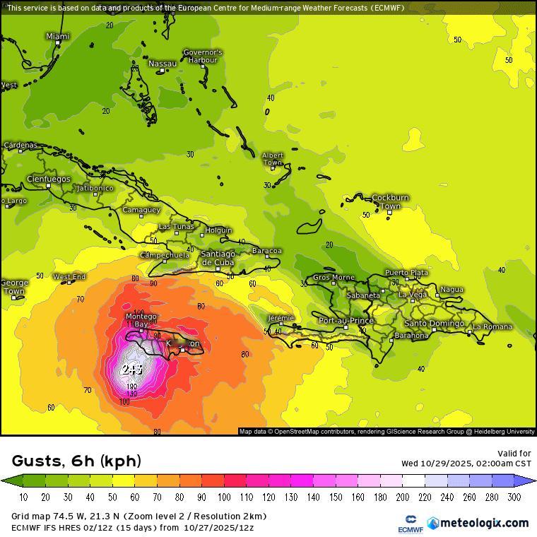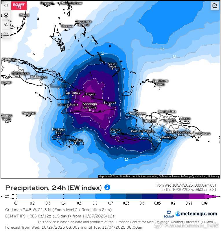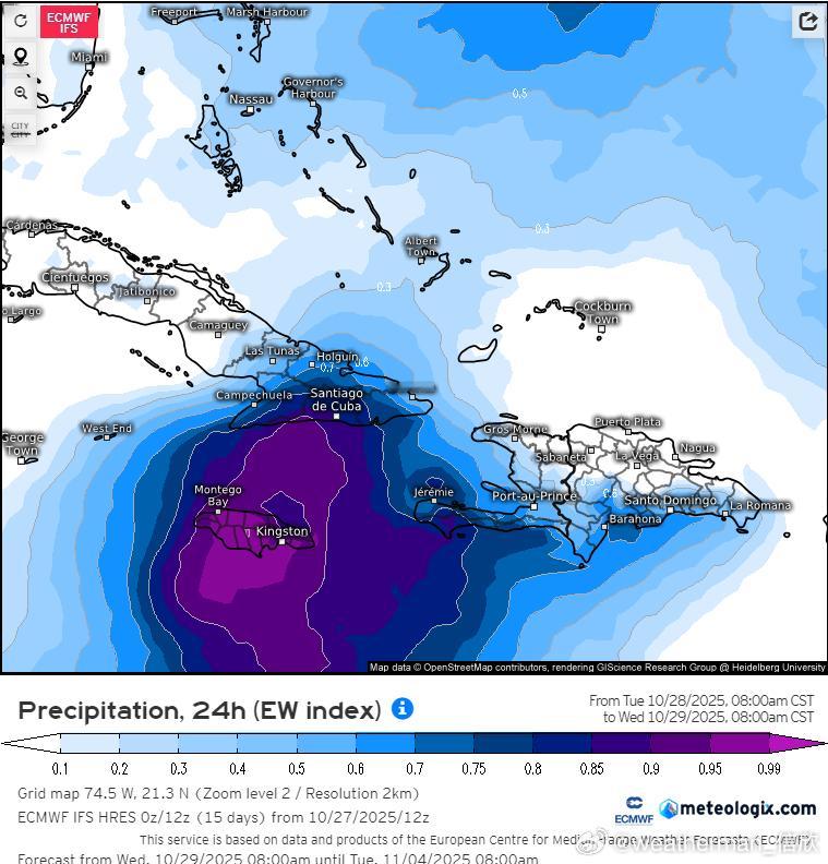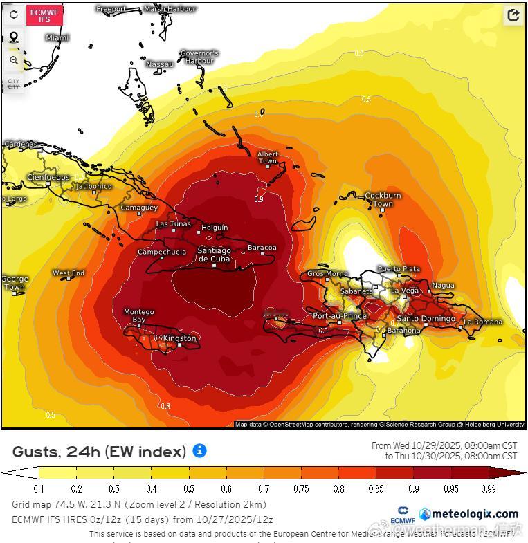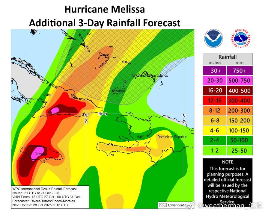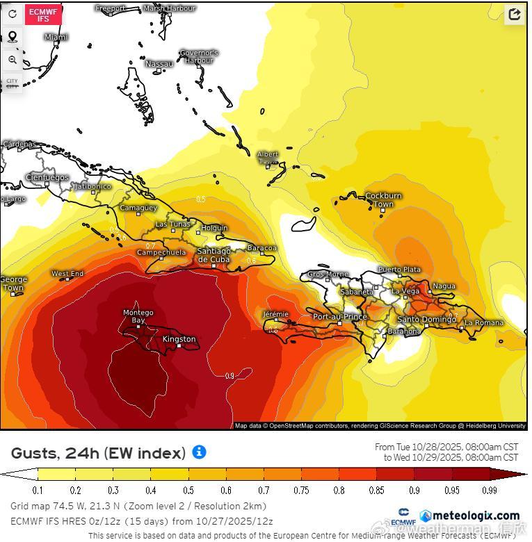 未来梅丽莎将转向北移动,可能在北京时间28日夜间-29日凌晨登陆牙买加,之后在29日下午-晚上,再次登陆古巴东部。从过程降水量看,牙买加和古巴东部,可达200-500毫米,局地超500毫米。并且飓风中心附近阵风超220公里/小时,17级以上,风雨强度可能破纪录。