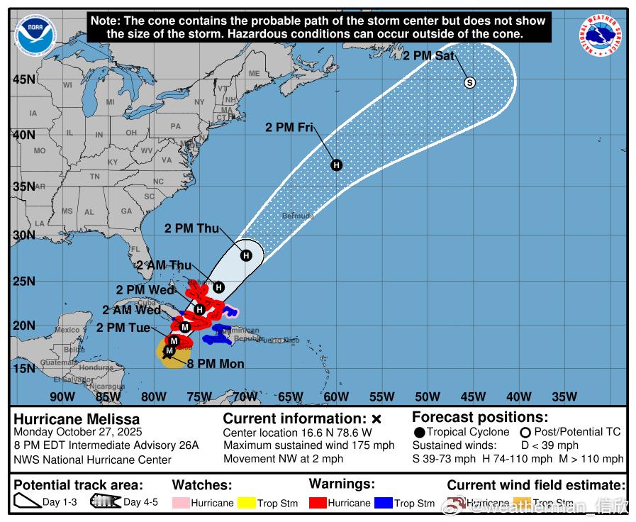 【飓风梅丽莎晋升风王】北京时间昨晚到今晨,加勒比海的飓风梅丽莎强度继续增强,美国飓风中心给出了150节的强度评价,达到了5级飓风,也就是最顶级的飓风等级。并且超过了之前台风桦加沙(美国给出145节强度),成为今年以来的全球风王。未来将重创牙买加和古巴东部。