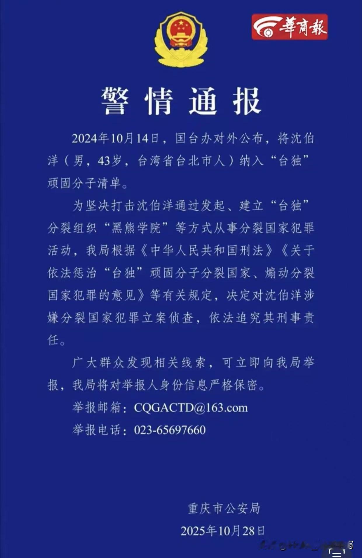 炸了!重庆公安突然出手,沈伯洋被立案侦查! 嘴上喊“抗中”,家里靠大陆赚钱,装备全靠淘宝买,两面三刀玩得溜? 别以为没人管得了! 国家早就盯上你了,去年上清单,今年直接动真格! 这下“黑熊学院”办不下去了,岛内那些搞分裂的,今晚怕是都睡不着! 支持国家亮剑,大快人心! 觉得挺解气的, 你觉得呢?对此你怎么看?