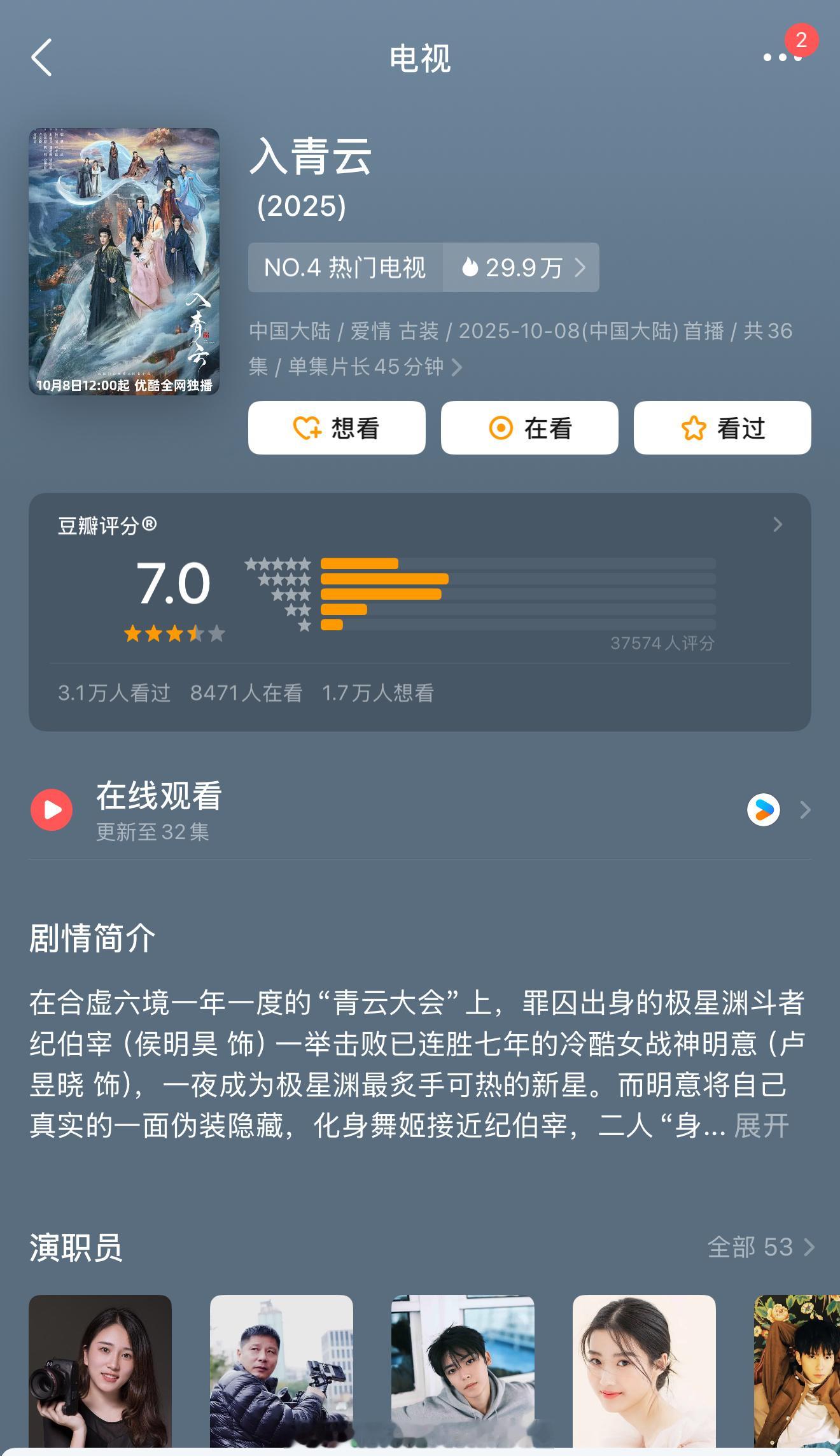 侯明昊卢昱晓《入青云》豆瓣开分7.0分,符合你们预期吗?![羞嗒嗒][羞嗒嗒]