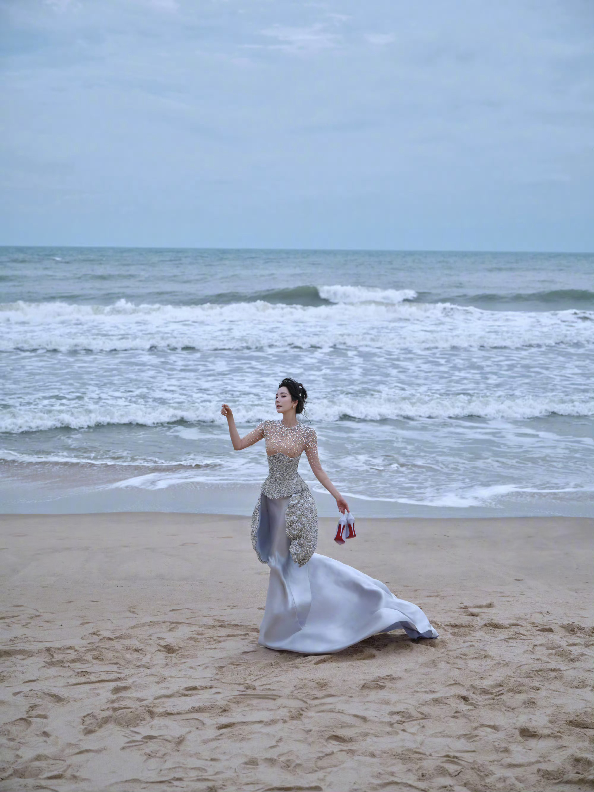 杨幂 身穿Miss Sohee 2025春夏高级定制系列紫色缎面拼接品牌标志性的蚌壳下摆亮相ELLE风尚大典红毯