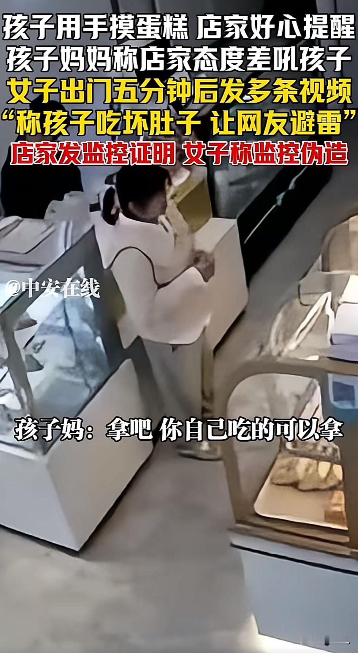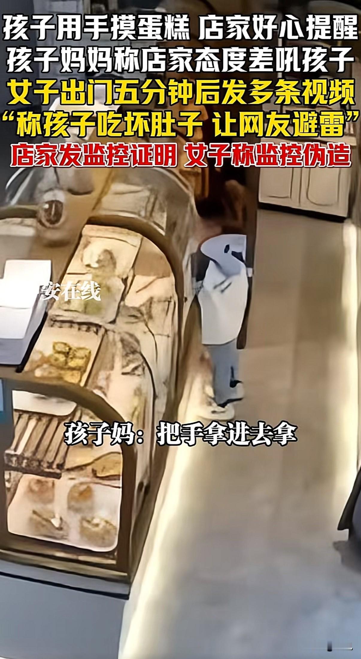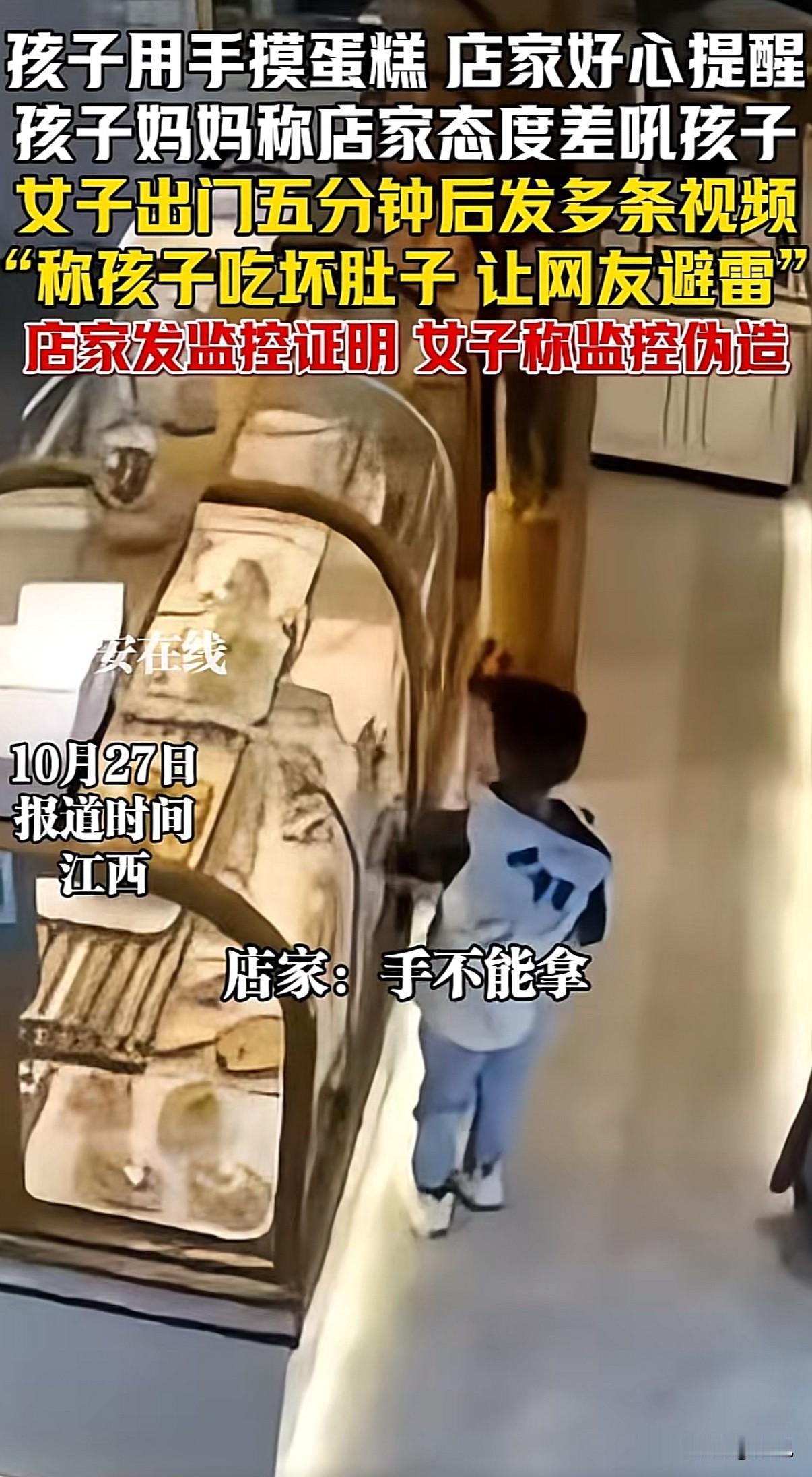 “恶人先告状”!江西景德镇一家蛋糕店里,一个小孩伸手去摸没包装的蛋糕。店员轻声提醒:“手不能碰,需要用工具取用。”还主动说要帮忙装袋。 监控里店员语气很平和。 孩子妈妈当场就不高兴了:“自己吃的为什么不能拿?”她还鼓励孩子继续摸蛋糕。 更精彩的来了。 离开店才五分钟,这位妈妈就在网上连发好几个视频。她说店家用的烂香蕉做假榴莲蛋糕,说孩子吃坏了肚子,叫大家避雷这家店。 视频一下子传开了,店铺名声受损。 店家只好公布完整监控。视频证明店员一直很有礼貌,孩子根本没在店里吃蛋糕,哪来的“当场吃坏肚子”? 面对监控证据,这位妈妈坚持说监控是伪造的,继续在网上质疑。 店家已经收集证据准备法律维权。这位妈妈随后删掉了自己主页的所有视频。 整件事有几个细节特别值得琢磨: 从买蛋糕到发视频说孩子吃坏肚子,中间只隔了五六分钟。这么短时间,蛋糕恐怕都还没拆开吃吧? 明明是自己先让孩子用手摸食品,被合理提醒后不但不认,反而倒打一耙。 有网友发现,这位妈妈以前就在别人晒娃的帖子下留言,说人家孩子“头大是不是有瘤”。看来她这习惯不是一天两天了。 最让人担心的是那个孩子。家长这样当着孩子的面颠倒是非,以后怎么教育孩子遵守规则? 网络给了每个人发声的机会,但不是谁声音大谁就有理。现在店家要法律维权,这位妈妈悄悄删了视频。事实证明,胡说八道是要付出代价的。 你们怎么看这种动不动就上网编故事的行为?