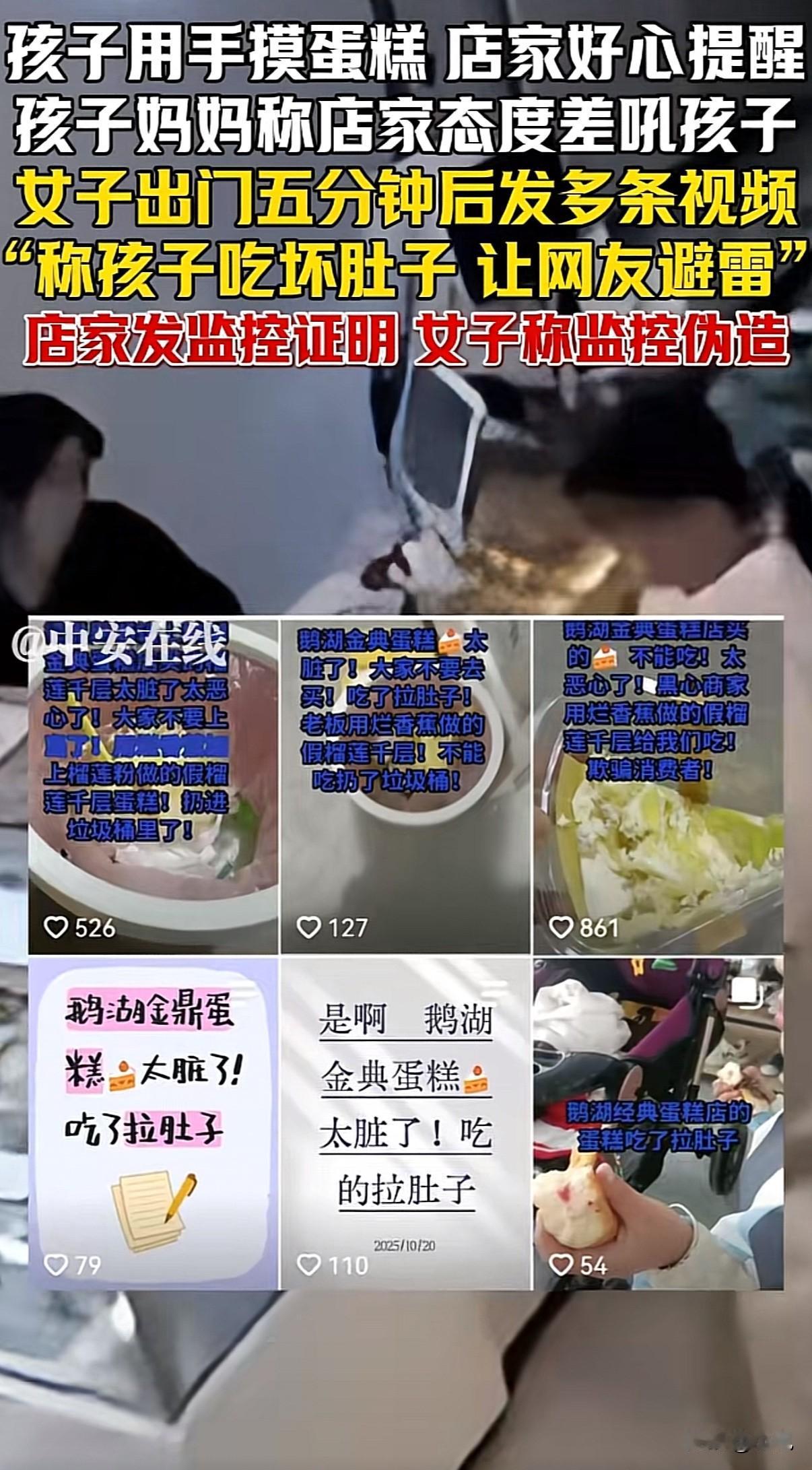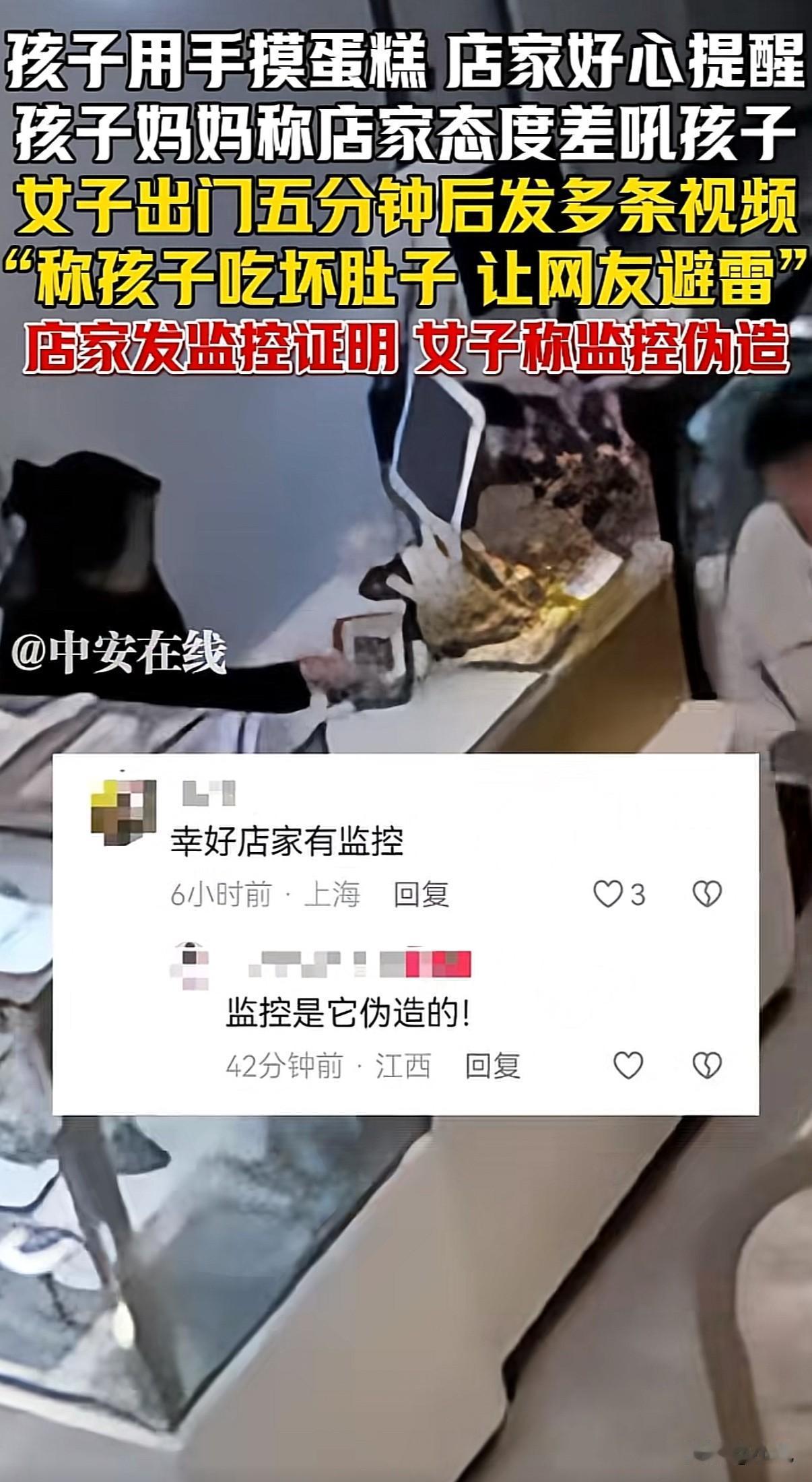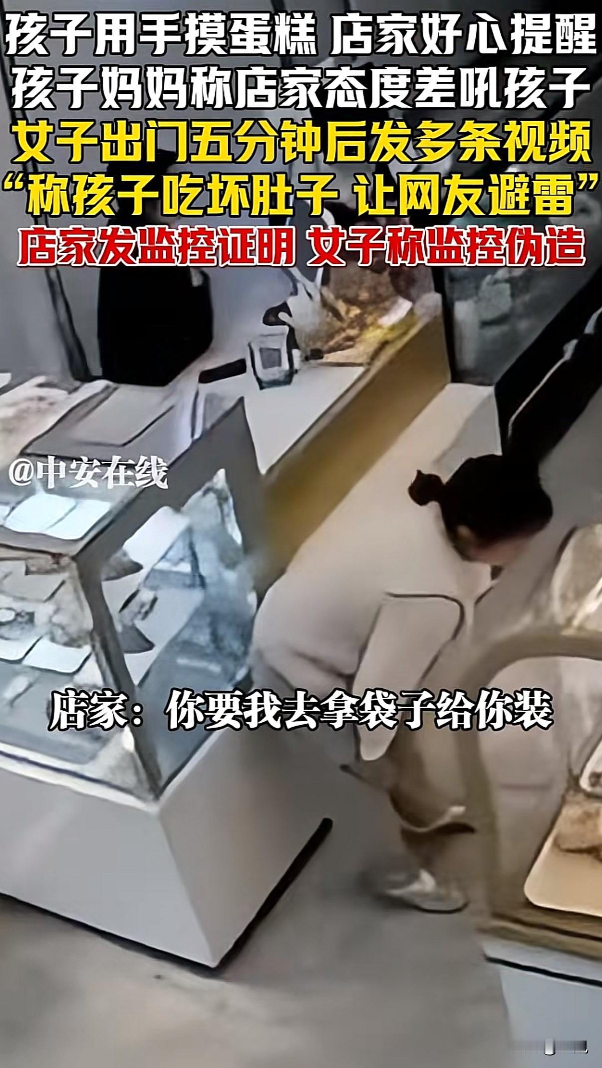 “恶人先告状”!江西景德镇一家蛋糕店里,一个小孩伸手去摸没包装的蛋糕。店员轻声提醒:“手不能碰,需要用工具取用。”还主动说要帮忙装袋。 监控里店员语气很平和。 孩子妈妈当场就不高兴了:“自己吃的为什么不能拿?”她还鼓励孩子继续摸蛋糕。 更精彩的来了。 离开店才五分钟,这位妈妈就在网上连发好几个视频。她说店家用的烂香蕉做假榴莲蛋糕,说孩子吃坏了肚子,叫大家避雷这家店。 视频一下子传开了,店铺名声受损。 店家只好公布完整监控。视频证明店员一直很有礼貌,孩子根本没在店里吃蛋糕,哪来的“当场吃坏肚子”? 面对监控证据,这位妈妈坚持说监控是伪造的,继续在网上质疑。 店家已经收集证据准备法律维权。这位妈妈随后删掉了自己主页的所有视频。 整件事有几个细节特别值得琢磨: 从买蛋糕到发视频说孩子吃坏肚子,中间只隔了五六分钟。这么短时间,蛋糕恐怕都还没拆开吃吧? 明明是自己先让孩子用手摸食品,被合理提醒后不但不认,反而倒打一耙。 有网友发现,这位妈妈以前就在别人晒娃的帖子下留言,说人家孩子“头大是不是有瘤”。看来她这习惯不是一天两天了。 最让人担心的是那个孩子。家长这样当着孩子的面颠倒是非,以后怎么教育孩子遵守规则? 网络给了每个人发声的机会,但不是谁声音大谁就有理。现在店家要法律维权,这位妈妈悄悄删了视频。事实证明,胡说八道是要付出代价的。 你们怎么看这种动不动就上网编故事的行为?