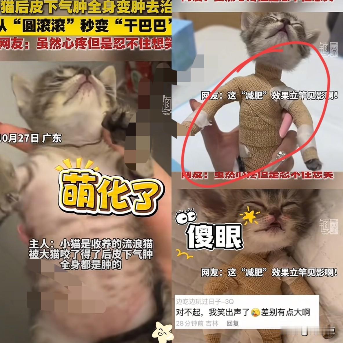广东,一博主养的宠物猫被咬了,身体出现了皮下水肿症状,肿的像气球一样!主人急得连夜送医放气。术后裹满纱布的它干瘪瘪像只小木乃伊! 网友调侃“孩子气性也太大了”,但这看似滑稽的画面背后,其实藏着致命风险! 很多人刷到视频先笑后慌,其实宠物皮下气肿根本不是“气大伤身”,而是外伤导致的危险状况! 空气侵入皮下可能引发感染,严重时还会影响呼吸,小猫至今没度过危险期就足以说明严重性! 养宠真的不能掉以轻心,毛孩子外出玩耍后,一定要仔细检查皮肤有没有隐蔽伤口! 虽然我笑出了声,但是还是希望小猫咪尽快好起来!