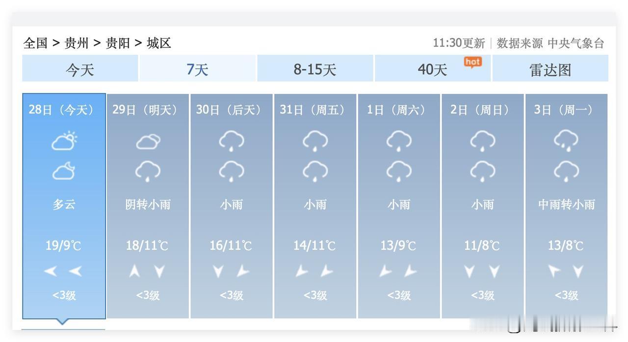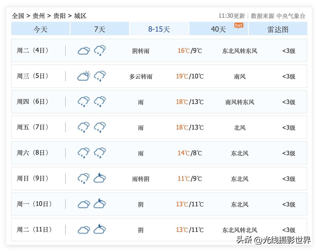 噢!我的老天爷啊!贵州省贵阳市,又要大降温了!10月29日到11月4日,贵阳降雨降温……11月2日,贵阳小雨,气温8-11度……货真价实的真正的冬天,真的要来了!贵阳人,最近已经穿上秋衣秋裤,看来只能明年3月脱掉了! 接下来……贵阳这天气,太阳真的是太珍贵了! 嗯,该去云南昆明喂红嘴鸥了!重庆人,成都人,贵阳人……退休老人,有钱有闲的,很多都在准备去云南或者海南了吧?!