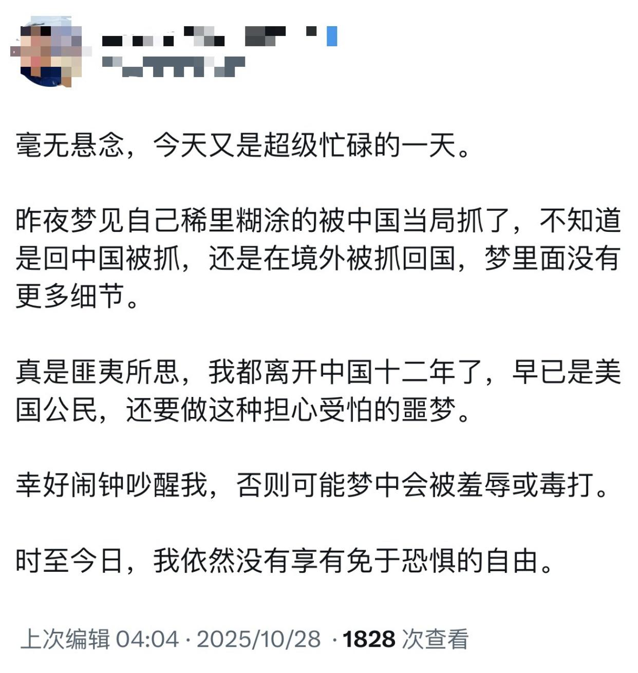 润到美国的华人男子发文表示:“ 真是匪夷所思,我都离开中国十二年了,早已是‘美国公民’,还要做这种担惊受怕的噩梦,时至今日,在美国,我依然没有享有免于恐惧的‘自由’。”
