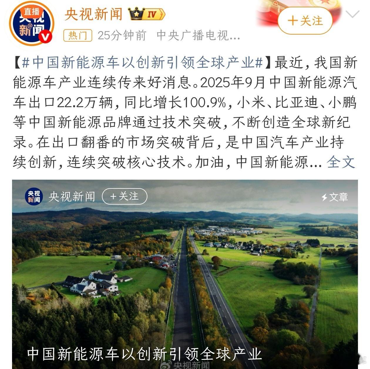 “近几个月,我国新能源车产业连续传来好消息。根据工信部统计,2025年9月中国新能源汽车出口22.2万辆,同比增长100.9%,中国新能源品牌在全球市场进一步打开局面、赢得全球消费者青睐。”