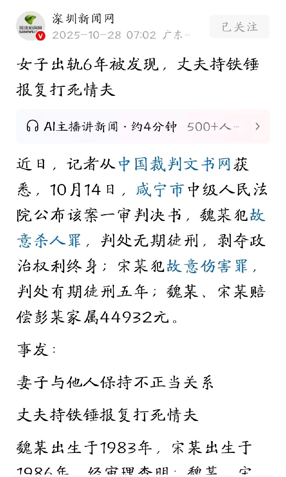 湖北咸宁,女子结婚11年后,为追求刺激,和其他男子不清不楚,而且,这种不正当关系一直维持了6年。被发现后,女子害怕被丈夫收拾,干脆谎称自己是被胁迫的。丈夫一听怒不可遏,当即开车追到情夫上班的公司,举起铁锤就朝他砸去。女子吓坏了,赶紧阻止并拨打急救电话,但不幸的是,情夫还是被砸身亡。男子自知闯了大祸,当场拨打110自首,这下,两人都悲剧了。 魏某和妻子宋某都是80后,2007年,两人携手步入婚姻殿堂,婚后育有一子一女,儿女双全的日子平凡又幸福。 然而,平静的生活在2018年被打破。 宋某通过微信聊天结识了男子彭某,一来二去,两人竟发展成了婚外情人关系。 刚开始,宋某心里也有些纠结,她既贪恋这份婚外的刺激,又担心事情败露影响自己的家庭。 一番思想斗争后,终究还是没能克制住自己,而且,这种不正当关系一直持续了六年之久。 2024年八月份,魏某从姐姐那儿听到了关于妻子宋某的流言蜚语,他又急又气,开始怀疑宋某背着自己在外面乱来。 于是,多次逼问宋某实情,但宋某一直遮遮掩掩,吞吞吐吐,想蒙混过去,可魏某誓不罢休,不依不饶。 10月4日,宋某实在扛不住了,只好把自己和彭某的婚外情告诉了魏某,害怕受皮肉之苦,她谎称自己并非自愿,是被彭某逼迫威胁的。 魏某一听妻子被逼了6年,怒火中烧,当即就要冲出家门,好好教训这个破坏自己家庭的人。 宋某见他像头发疯的狮子,害怕闹出人命,便劝他冷静。 但此时的魏某已经被愤怒冲昏了头脑,根本听不进去,一心想着报复彭某,宋某拗不过,只好跟着魏某一同驾车去寻找彭某。 途中,宋某心里非常矛盾,她实在不想事情闹大,要是闹到人尽皆知的地步,那她的脸就没地搁了。 但她不敢再忤逆魏某,只好如实告知了彭某公司的具体位置。原来,彭某在一家公司当保安,当晚,正好是他在值班。 晚上七点左右,魏某开着面包车,带着宋某来到了彭某所在公司,他把车停在公司对面后,两人下车步行到了公司门口。 为了是彭某放松警惕,由宋某出声,喊彭某打开了伸缩门,宋某赶紧挡在伸缩门中间,防止他关门。 这时,手持铁锤的魏某突然从后面蹿出来,冲到了保安室门前。 彭某见情况不妙,想要关门,但魏某反应很快,左手一把扯住门把手,右手持锤从门缝中朝内捶打彭某,彭某反应不及,一下子就被打倒在地。 魏某还不解气,进入室内继续持铁锤击打彭某的头部,一下又一下,发泄自己积攒多年的愤怒。 看到这一幕,宋某吓坏了,赶紧冲进去阻止魏某,同时,拨打了120急救电话。 恢复理智的魏某这才意识到自己闯了大祸,知道自己逃不掉,便主动投案自首。 救护车到达现场时,彭某已确认死亡,经鉴定,彭某系被他人用钝性物体打击头部,致开放性重型颅脑损伤死亡。 案件进入司法程序后,关于魏某的量刑,他的辩护人提出,魏某在情绪失控的情况下,持锤猛击彭某头部,造成了彭某当场死亡的严重后果,依法应予以严惩。 但本案事出有因,彭某与宋某之间长期保持不正当两性关系,丈夫魏某得知实情后,确实难以控制个人情绪,属于激情犯罪,应对他从轻从宽处罚。 而且,魏某在作案后能够主动投案,如实供述自己的罪行,所以可对他从轻处理。 而宋某的辩护人则提出,宋某在本案中未实际实施对被害人的伤害行为,属于从犯,而且在案发后有拨打120急救电话,请求对其判处缓刑。 法院会如何判决呢? 根据《刑法》第二百三十二条规定,故意杀人的,处死刑、无期徒刑或者十年以上有期徒刑;情节较轻的,处三年以上十年以下有期徒刑 。 魏某在得知妻子宋某与彭某的婚外情后,起意报复,持铁锤多次击打彭某头部,致其重型颅脑损伤死亡,其主观上具有剥夺彭某生命的故意,客观上实施了杀害彭某的行为,符合故意杀人罪的构成要件。 宋某明知魏某要报复彭某,仍指引魏某找到彭某的工作地点,并诱使彭某打开大门,为魏某实施伤害行为提供了帮助,属于从犯。 但本案因婚姻家庭矛盾激化引发,魏某属于激情犯罪,且两人都有自首情节,可以从轻、减轻处罚。 综上,法院判决,魏某犯故意杀人罪,判处无期徒刑,剥夺政治权利终身,宋某犯故意伤害罪,判处有期徒刑五年。 此外,彭某家属还要求魏某和宋某赔偿各项经济损失84.5万元,法院对其中44932元的丧葬费予以支持,其余要求不予支持。