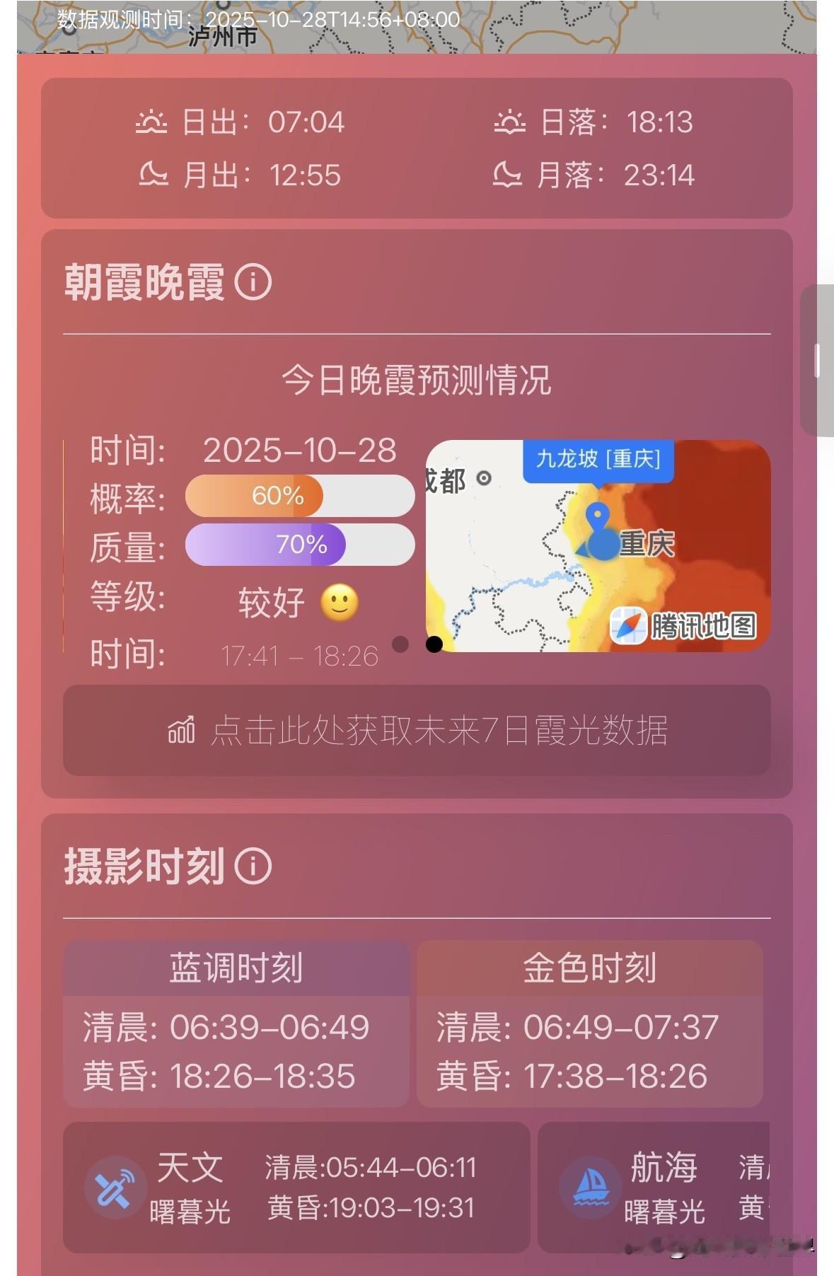 10月28日,我要从成都赶回重庆看日落和晚霞!前天晚上,我在成都春熙路和太古里,遇到了今年秋天最美的秋雨,华西秋雨打湿了春熙路,流光溢彩……游客数量不多不少,非常适合拍摄摄影大片! 昨天,我在毕棚沟看到了2025年秋天毕棚沟最美的秋色和雪山…… 老天爷啊,保佑我今天傍晚,能够在重庆主城区看到不错的晚霞日落啊! 可是,临近冬至日,不适合去南山看日落晚霞……南山一棵树……现在太阳从摄影画面的最左侧落下来,构图不好看啊! 要等到太阳从靠近画面中间的位置落下来的时候,夏至及7月……而且,拍完日落,最好在蓝调时刻亮灯……顺便再拍个重庆夜景的大全景啊! 可是,冬天,蓝调时刻,重庆主城区,渝中半岛的灯饰工程,好像要等到晚上8点才亮灯?! 嗯,洪崖洞好像已经改到6点半亮灯了,鸿恩寺好像改到晚上7点亮灯了……但是,重庆渝中半岛的夜景要等到晚上8点亮灯……这就……不太适合去重庆南山了……毕竟,去南山的成本要高得多的嘛! 嗯,如果去鹅岭公园,因为太阳从重庆第一高楼的左边落下来,所以……摄影构图的画面也不太好啊! 怎么办啊?! 嗯,如果去李家沱码头,长江灯塔这里看李家沱长江大桥的日落……这个季节,太阳从李家沱大桥的最左侧的建筑这里落下来,不会出现在李家沱大桥上,所以,摄影构图画面也不理想…… 好像只有南滨路海棠溪看菜园坝大桥的日落……或者,在山城巷看菜园坝大桥的日落…… 哎呀! 总体来说,重庆的日落,还是5月到9月,总体比较好,尤其是6月7月……8月也不错……9月就不太好……9月有一些天,在鹅岭公园看日落,太阳正好从重庆第一高楼落下,被遮挡了……不太好啊! 嗯嗯,如果没有晚霞,只有日落,那么,去看菜园坝长江大桥的日落……去看轻轨3号线在菜园坝长江大桥被夕阳映衬的暖色调……还是可以! 可是,10月28日,重庆主城区,不仅有日落,可能还有晚霞,而且能见度好像也还不错…… 怎么办?!究竟怎么办啊?! 不能去南山! 不能去鹅岭! 不能去李家沱码头! 究竟去哪里啊?!