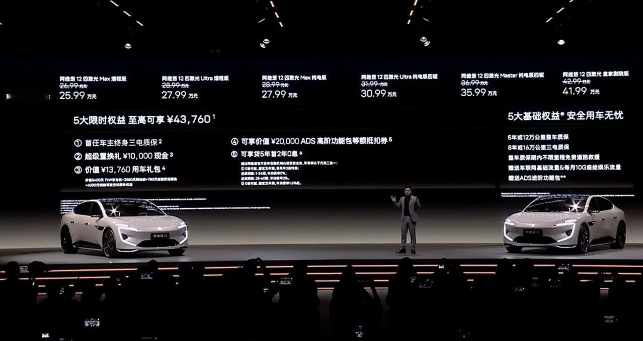 阿维塔12四激光版上市,定位“五心”豪华轿车,建议零售价26.99万元起,享受权益后到手价25.99万元起,全系同享购置税无忧安心礼。 在华为乾崑ADS 4、鸿蒙座舱HarmonySpace 5等豪华科技的加持下,阿维塔12四激光版号称能带来百万体验,并且“30万轿车无出其右”。 华为余承东表示,华为ADS 4感知更精准、反应更快速、驾驶更安全,云端世界引擎通过百万级场景训练,实现智能驾驶从"类人"到"超人"的跨越。