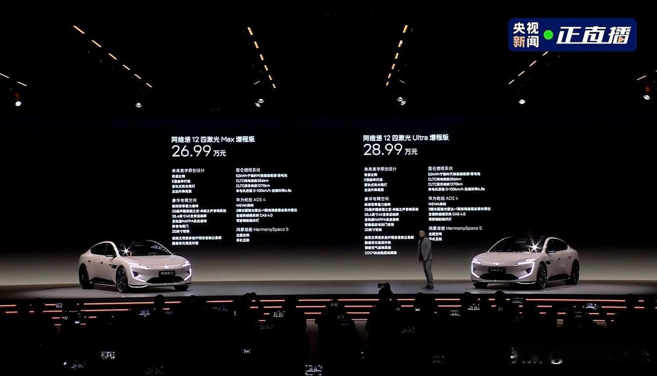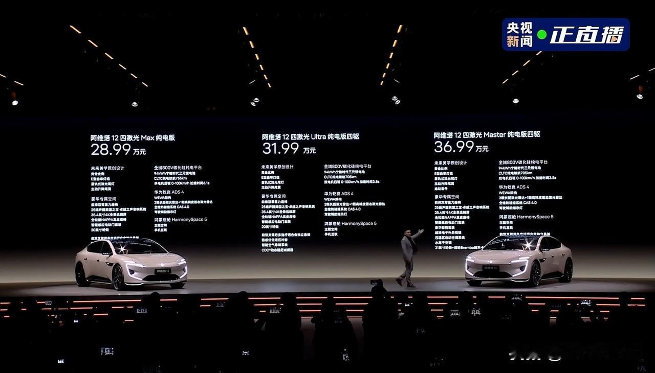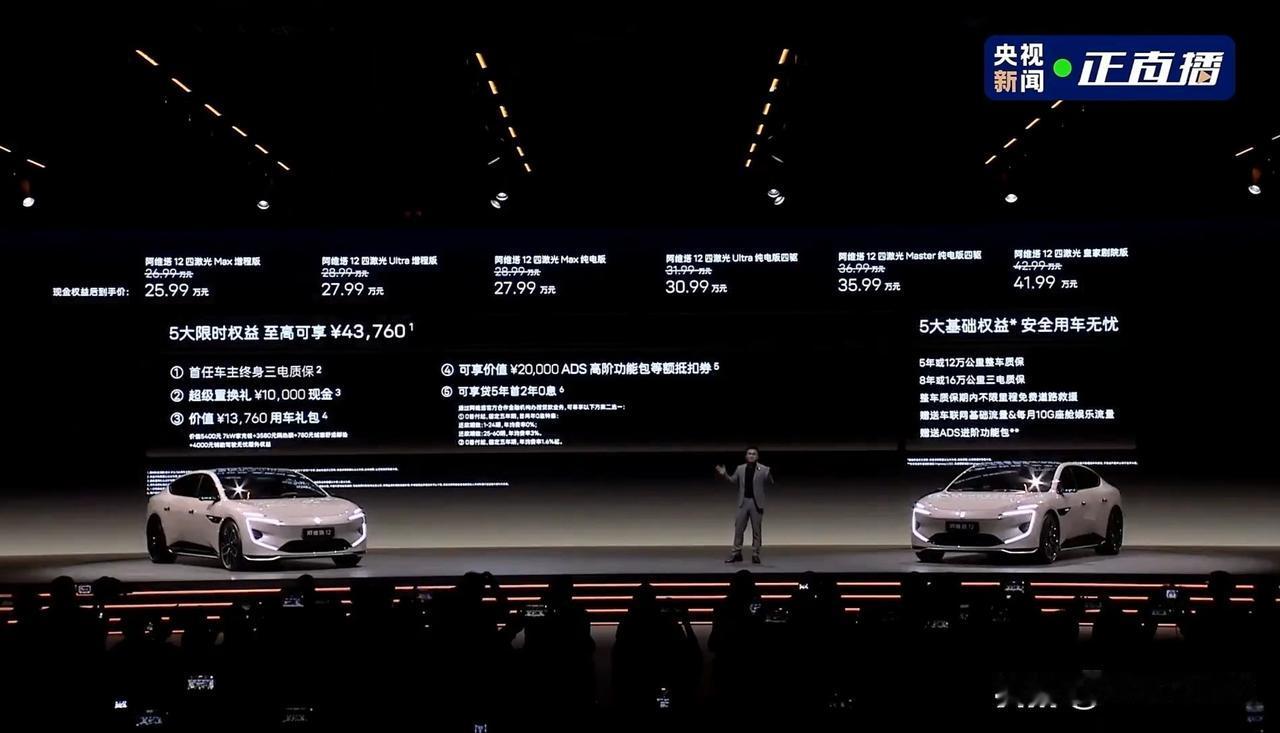 阿维塔 12 四激光版正式发布,算上皇家剧院版一共有 6 款车型∶ 阿维塔 12 四激光 Max 增程版,26.99 万元 阿维塔 12 四激光 Ultra 增程版,28.99 万元 阿维塔 12 四激光 Max 纯电版,28.99 万元 阿维塔 12 四激光 Ultra 纯电版四驱,31.99 万元 阿维塔 12 四激光 Master 纯电版四驱,36.99 万元 阿维塔 12 四激光皇家剧院版,42.99 万元 首任车主终身三电质保,置换立减 1 万,首发送宁德时代超薄磁吸无线充电宝。最后就是阿维塔也宣布了全系车型跨年购置税补贴方案。[灵光一闪]