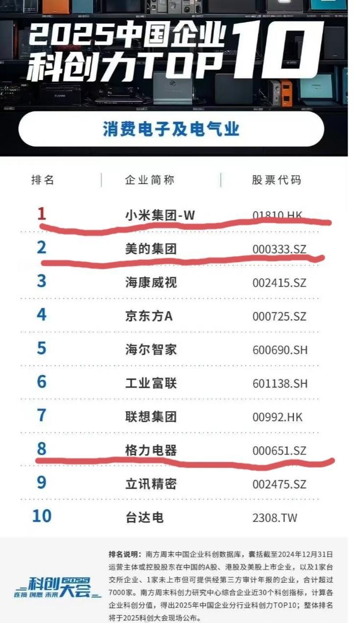 2025年中国消费电子及电气业企业科创力排名top10榜单! 小米第一,美的第二,格力第8,联想第7,台积电第10。 也就是说,在中国众多消费电子及电气业企业当中,小米集团在科技创造力方面敢说第二、没人敢说第一。 而且发起这个评选的是《南方周末》,这个可是广东的媒体,这下应该没有人质疑这是一个野榜了吧! 看来小米集团一年几百上千亿的研发投入还是取得了非常不错的效果的!