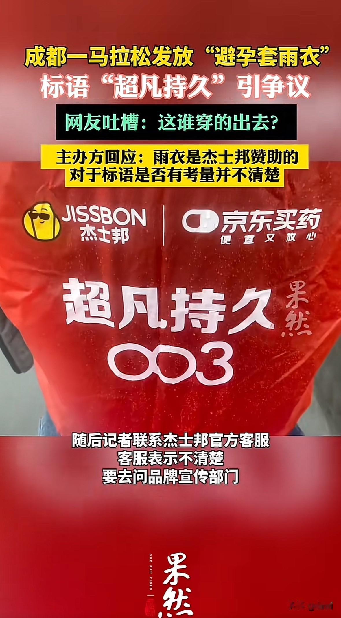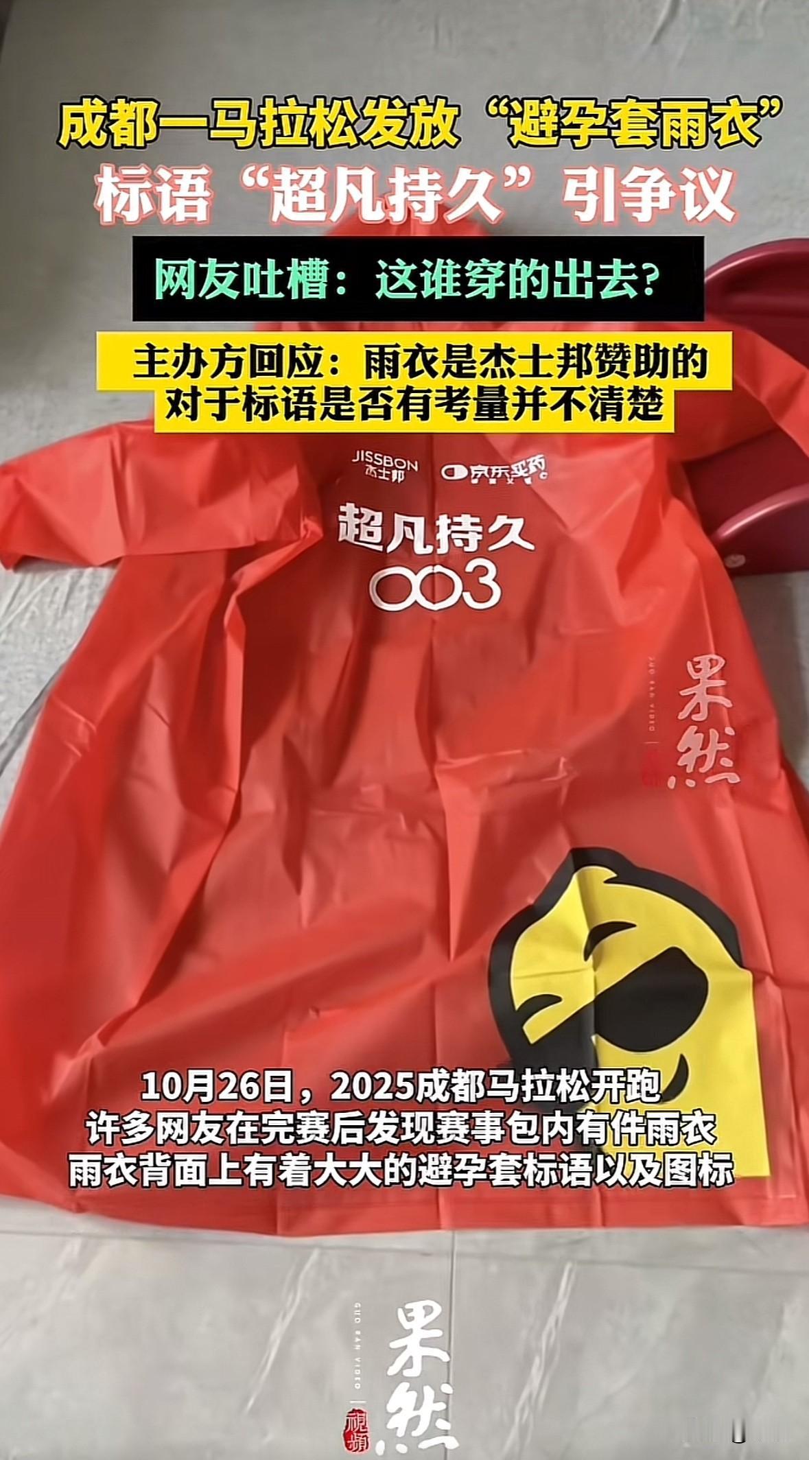 10月26日成都马拉松开跑,完赛选手发现赛事包里的雨衣背面印着巨大避孕套图标和“超凡持久003”标语。网友纷纷晒图吐槽“这玩意谁穿的出去”,直呼社死。 10月28日主办方回应,雨衣是杰士邦赞助的,对标语是否有考量表示不清楚。联系杰士邦客服,对方也说要问宣传部门,没给明确说法。 赛事赞助常见,但广告得考虑场合。马拉松是全民体育活动,这种私密用品标语印在公共使用的雨衣上,确实尴尬。主办方连赞助物料内容都不审核,太不专业。品牌想曝光也得选对方式,硬蹭反而招反感,最后两边都落不着好。