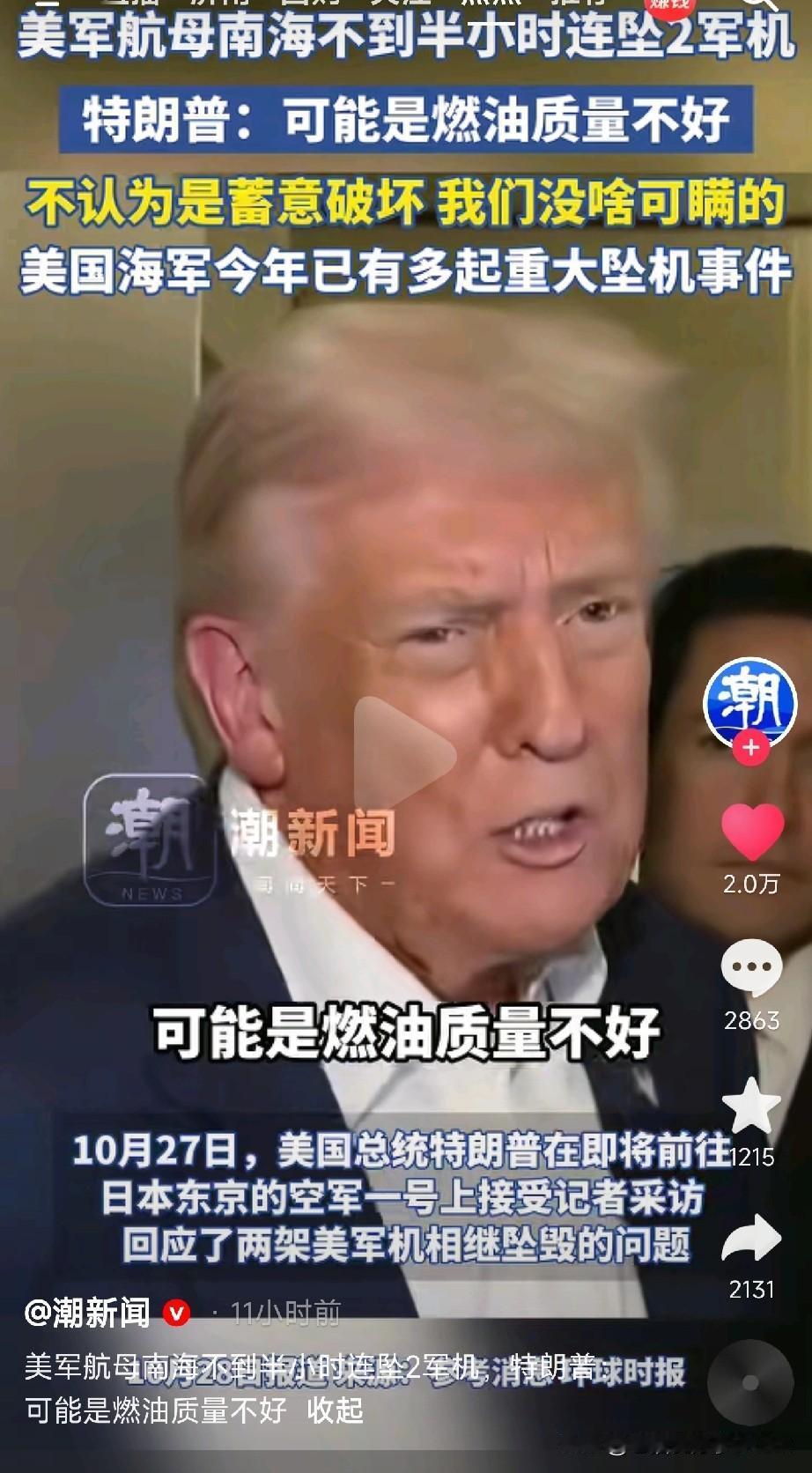 美军南海半小时坠两机, 特朗普甩锅加油站? 突发消息!美军航母在南海上演“高空跳水”,不到半小时连续坠毁2架军机,场面一度十分尴尬。 更让人目瞪口呆的是特朗普的回应——在空军一号上轻描淡写:“可能是燃油质量不好”。 这话说的,仿佛美军航母在南海加到了劣质汽油,得找加油站维权似的! 今年美军坠机已成家常便饭,但这次着实离谱。 有网友神评: “懂了,下次得自带燃油检测仪出征”。 “建议美军优先采购中石油加油卡”。 “甩锅技术比飞行技术稳定多了”。 说正经的, 世界最强海军为何事故频发? 高强度部署疲于奔命? 装备老化维修不力? 还是南海风浪太大? 或许,真正需要检修的不是战机,而是某些人四处巡航的野心。 (文章素材来自潮新闻,侵删)