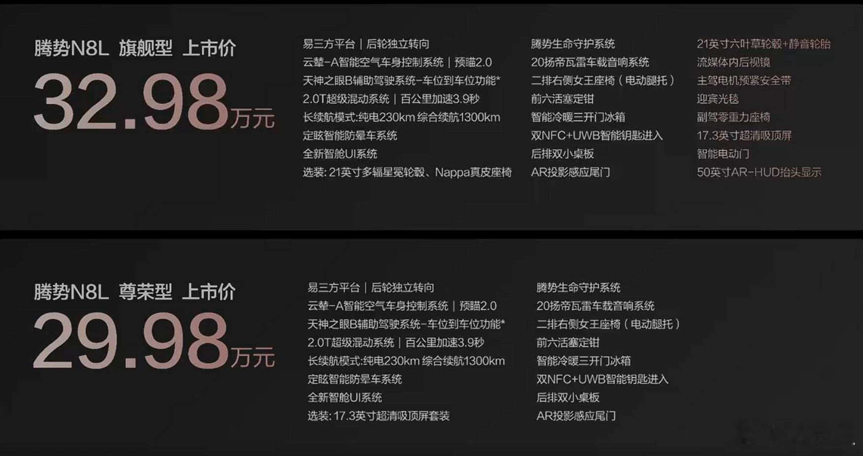 一台家人全票通过的车想选辆全家都夸好的车,简直比登天还难!爸爸要操控性能强,妈妈得安全又舒服,孩子想要空间大还好玩,这要求一堆,能满足的车少之又少。不过,新上市的腾势N8L或许就是那个“天选之子”。它大六座设计,5.2米车身加上真正的大三排,空间管够。全系标配六大核心科技,还有后排娱乐屏、帝瓦雷音响、智能冰箱这些百万豪车才有的配置。安全又舒享,全家出行超合适。29.98万起的价格也挺实在