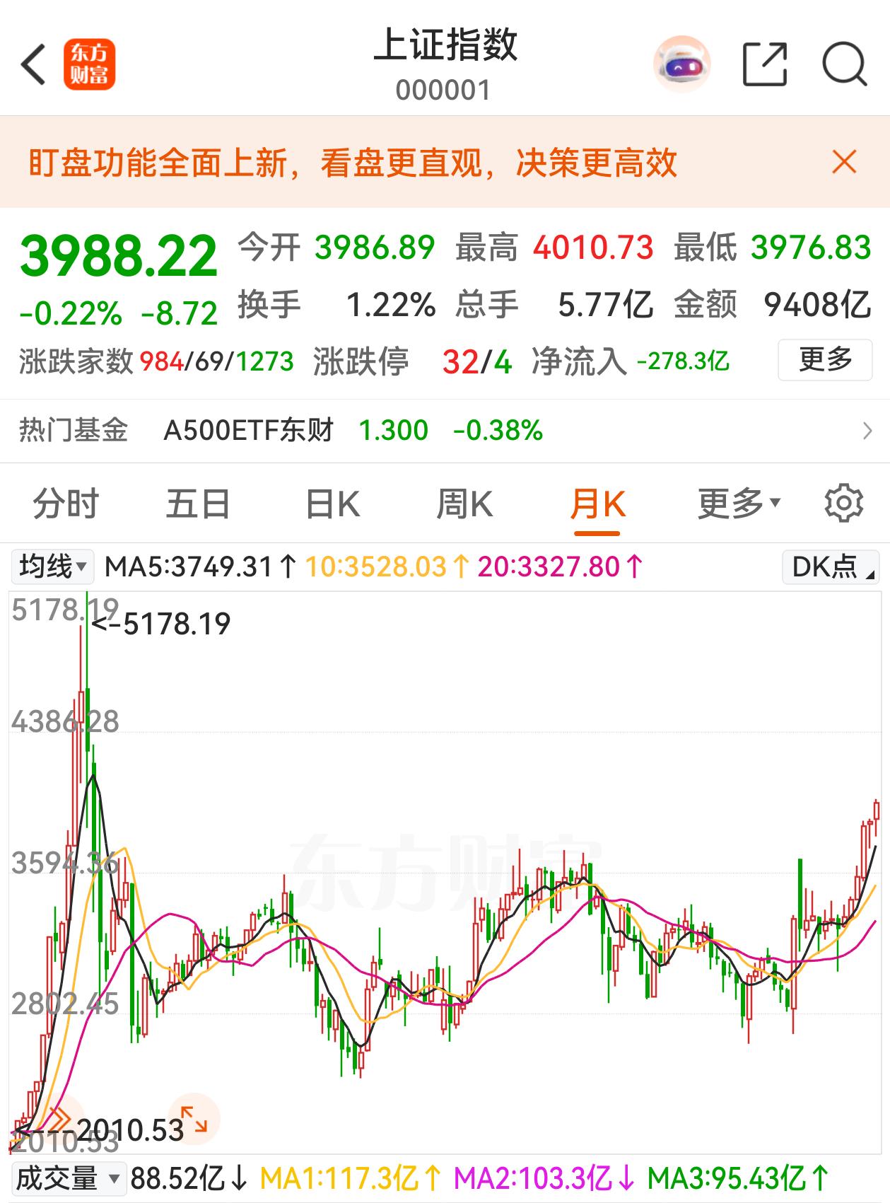 4000点得而复失,A股又一次重复昨天的故事。上证指数在上摸4100点之后,还是被死死的按在了4000点之下,个股绿肥红瘦,主力资金净流出591亿元。 美股、日股不断创出新高,A股却一直在4000点之下徘徊,长时间看,2008年金融危机之后,美股就一直走在上升通道之中;日本股市2010年6000点,现在站上50000点了。A股的走势呢,2015年8月跌破4000点,现在还是4000点之下。要说美股有科技七姊妹,咱们没法比,怎么日本股市的涨幅也比我们大很多呢? 4000点好像成了A股的一座山,两个多月过去了,怎么努力就是难以翻过去。原因可能是心理因素的影响,A股在4000点之下十年之久,4000点已成了人们心中的天花板,人们习惯了趴在4000点之下,见到4000点就见好就收,对市场持续上行信心不足;恐高情绪主导市场,按理说A股的估值与全球主要市场相比是偏低的,尽管A股底部反弹以来有一定涨幅,但股市估值依然偏低,但恐高情绪主导市场,机构散户竞相跑路,筹码根本就买不完,眼看4000点站不稳,午后大盘只好选择跳水;还有就是量化交易的打压,量化交易就是靠短线交易获利,量化资金规模扩大,量化交易占比也在提升,有数据显示:5月份量化交易占比8—12%,9月份量化交易量占比超过20%,10月份估计占据日成交量的25—30%,这些资金大单出小单进,大大消耗了多头资源 ,数据显示主力资金几乎总是净流出,很少有资金净流入的交易日。 股市涨跌很正常,调整的原因也很多,不过4000点不会是上证指数的顶部,你怎么看?