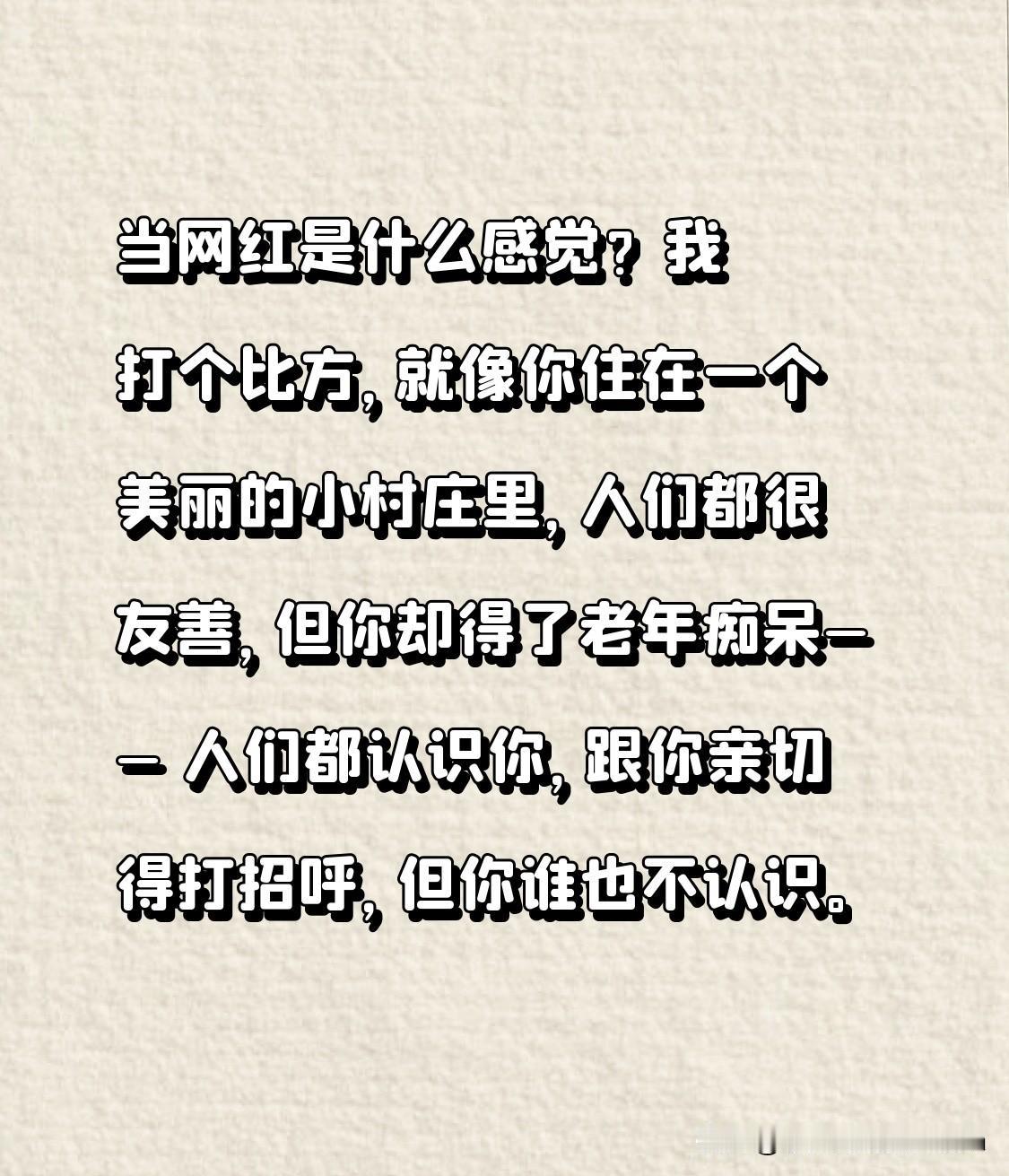 当网红是什么感觉?我打个比方,就像你住在一个美丽的小村庄里,人们都很友善,但你却得了老年痴呆—— 人们都认识你,跟你亲切得打招呼,但你谁也不认识。[呲牙]