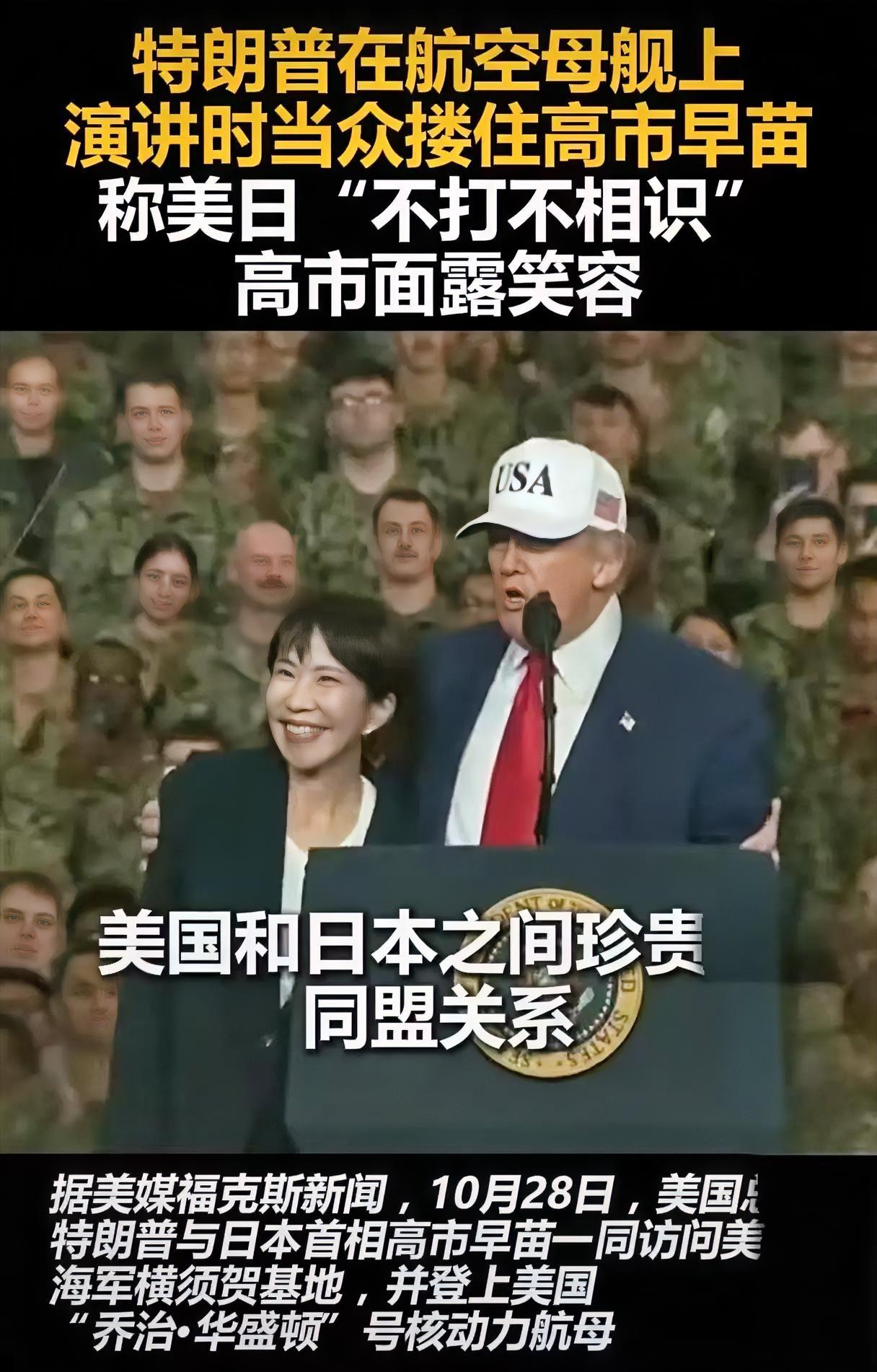 特朗普这一举止真是既辣眼睛又扎心窝 10月28日,美国总统特朗普带着日本首相高市早苗一同到驻日美军横须贺基地,并登上“乔治·华盛顿”号航母发表演讲。 只见特朗普直接上手搂着高市早苗向驻日美军说:美国和日本之间珍贵的同盟关系,诞生于一场可怕战争的废墟中,我们的纽带在80年间发展为全世界最非凡的关系之一。 别看在一旁被特朗普搂着的高市强装着笑容,很是配合的样子。信不信,假如美国如今已落魄,就凭高市拜“鬼”成瘾的作风,听到老特提起“战争的废墟”,肯定想到当年日本被美国丢下的两枚原子弹,估计直接露出獠牙扑向老特的脖子。 友友们看到特朗普与高市早苗的“暧昧”互动,有什么想说的吗?欢迎在评论区分享交流。