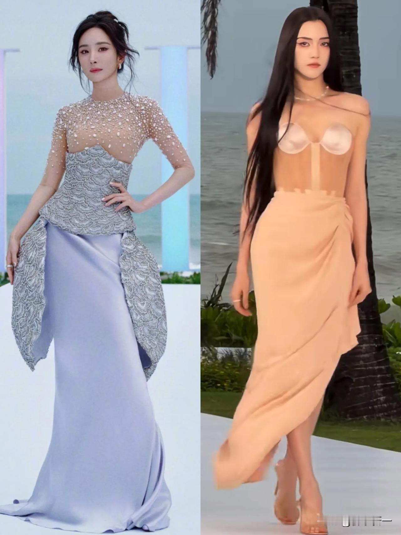 这一夜,将杨幂的“充气胸”和娜然的机械神女放在一起,高下一下就立判了。 幂姐这一次想靠卖弄风情出圈也是被娜然捷豹了啊! 肉色半拖底的胸和腰部肉色打底放在一起,从未觉得后一件衣服这么好看过啊。 杨幂是真的被造型团队害惨了吧,明明地位也高这么多可选的衣服,偏选了争议最大的一条,明明靠作品就能长红,偏要以身材为卖点。 十岁的年龄差一出,我还是选娜然了!