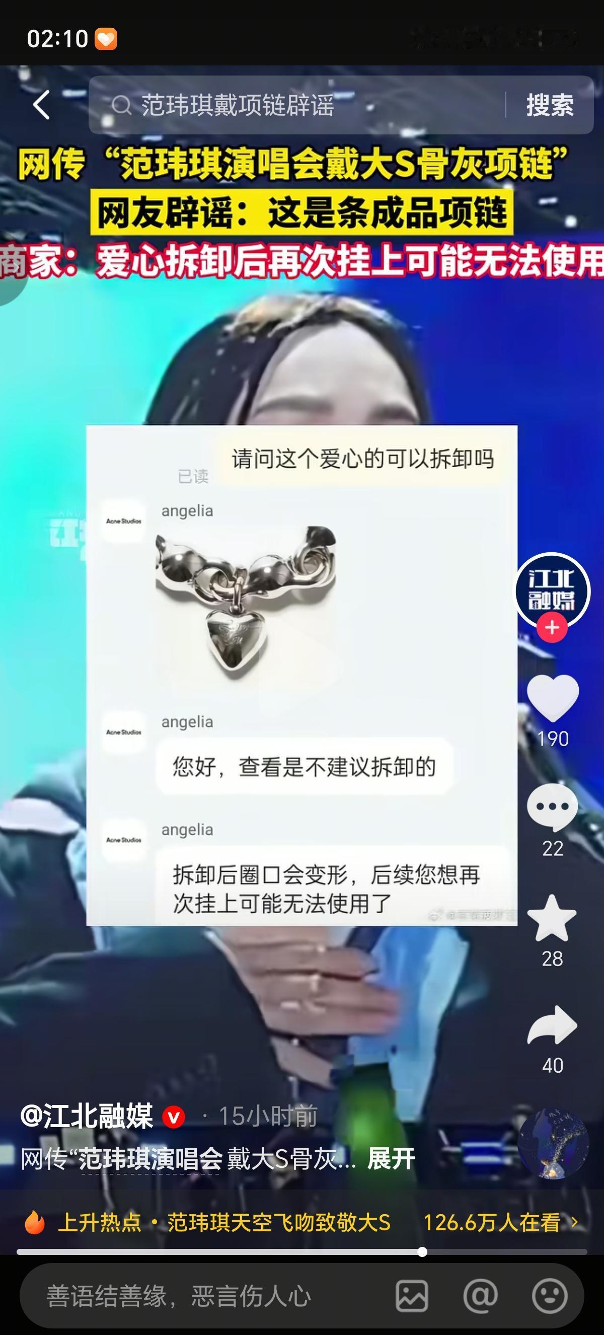 范玮琪“佩戴大S骨灰链”这个事情真假先不说,就说她在演唱会干了啥吧,10月27日,范玮琪在江苏盐城演唱会上演唱与大小S友情相关的《可不可以不勇敢》时,多次抚摸颈间黑色心形吊坠,演唱结束后还向天空飞吻,连续飞吻了3次。 《可不可以不勇敢》这首歌,大S和小S参与了歌曲的和声部分,还友情出演了歌曲的MV。这首歌平时她唱不唱不知道,演唱会上是唱了。 最后说她戴的是大S骨灰链的人太多了,舆论影响太大了,她出来辟谣说她戴的是普通项链,她还找商家证实,说是这个爱心吊坠不能拆卸。 这个事情的结果是她确实火了,以前也就是演唱会跟张韶涵在同一天火了,不知道这样的结果是好的还是不好的?