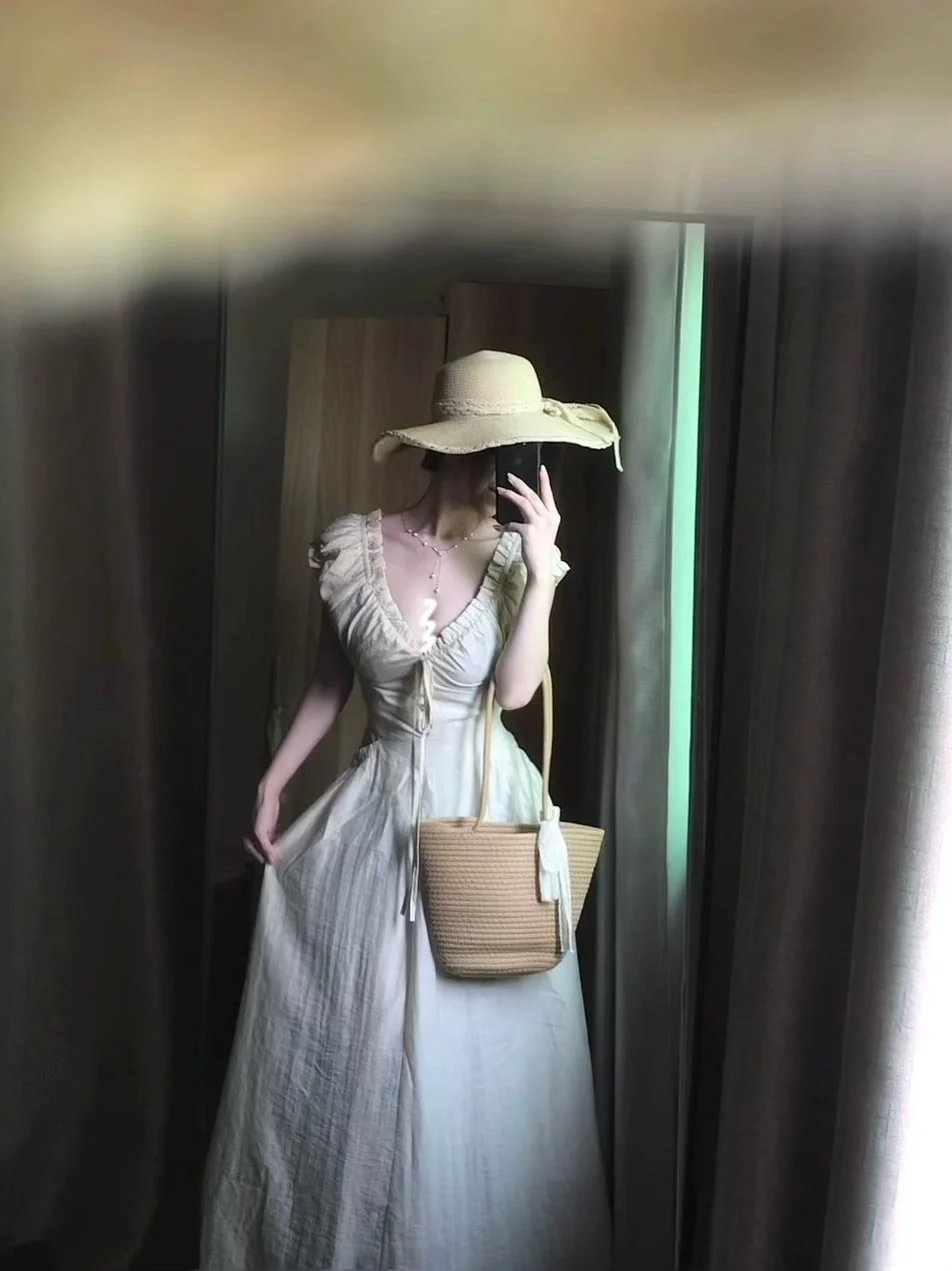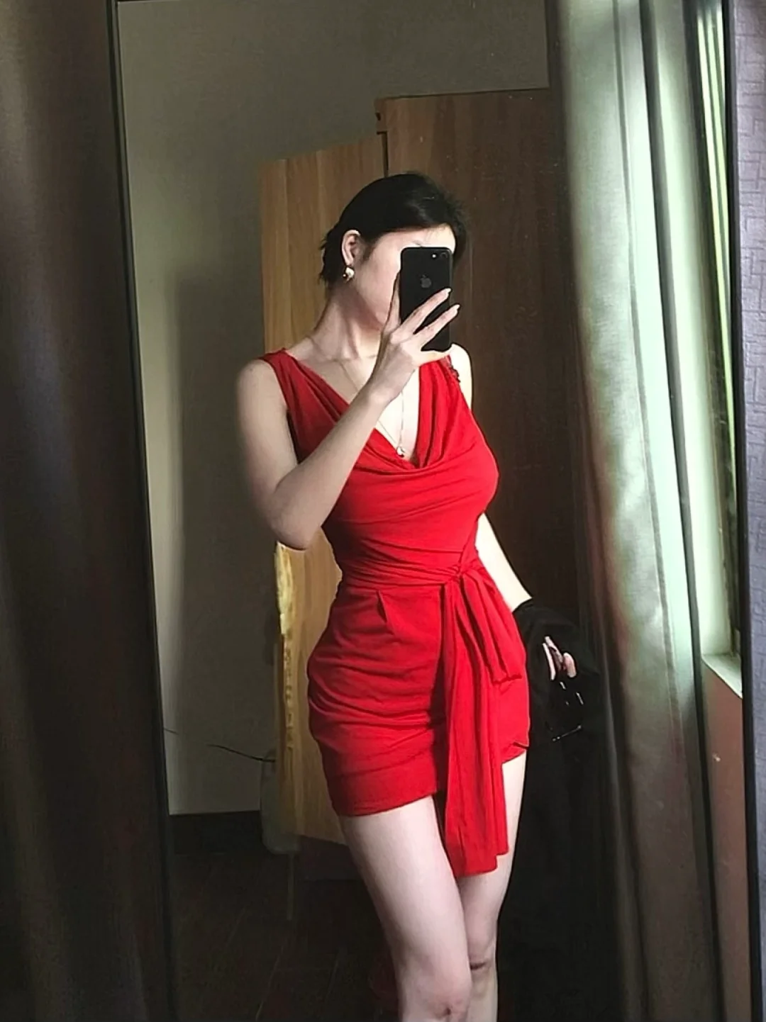 粉色连衣裙,优雅气质,镜前自拍,美不胜收!