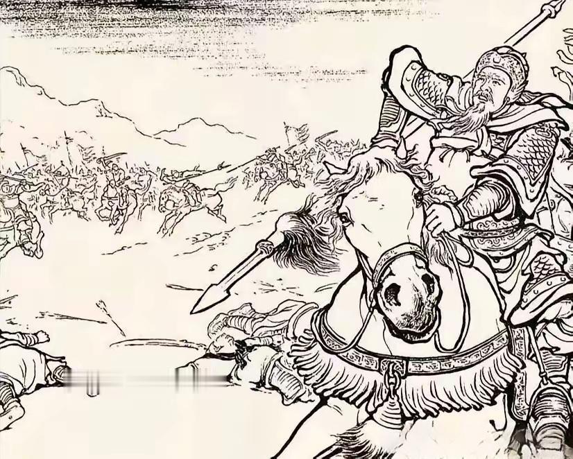仰天长叹。此图中一员大将须发皆白,立马挺枪看到战场上的形势一发不可收拾...