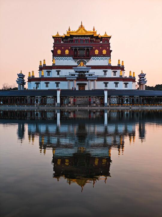 人称小布达拉宫,荟萃藏族艺术装饰,融合了彩绘、壁画、木雕、唐卡等数十种藏地传统建筑装饰技艺!可以利用湖面拍摄倒影,对称构图绝美