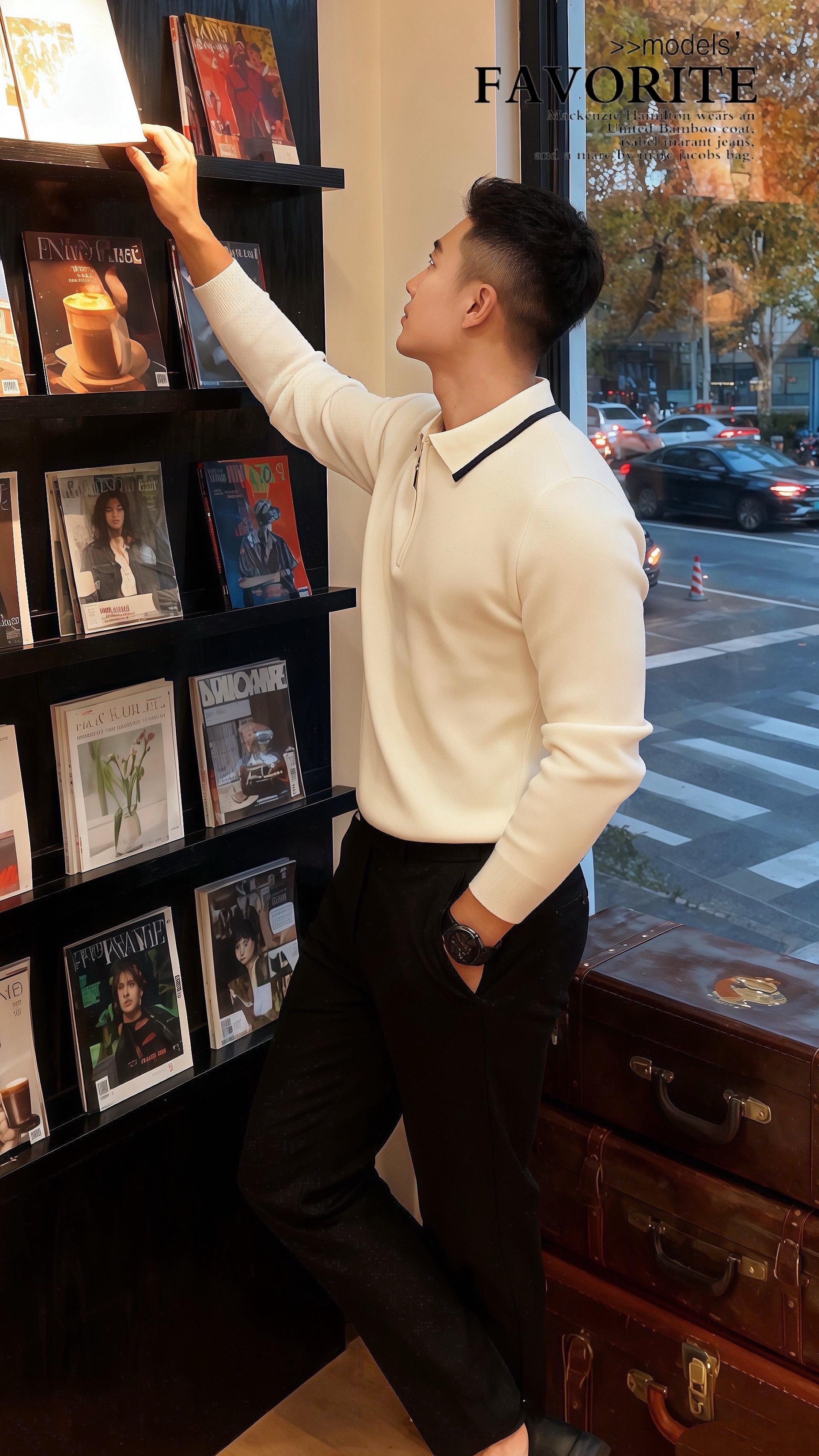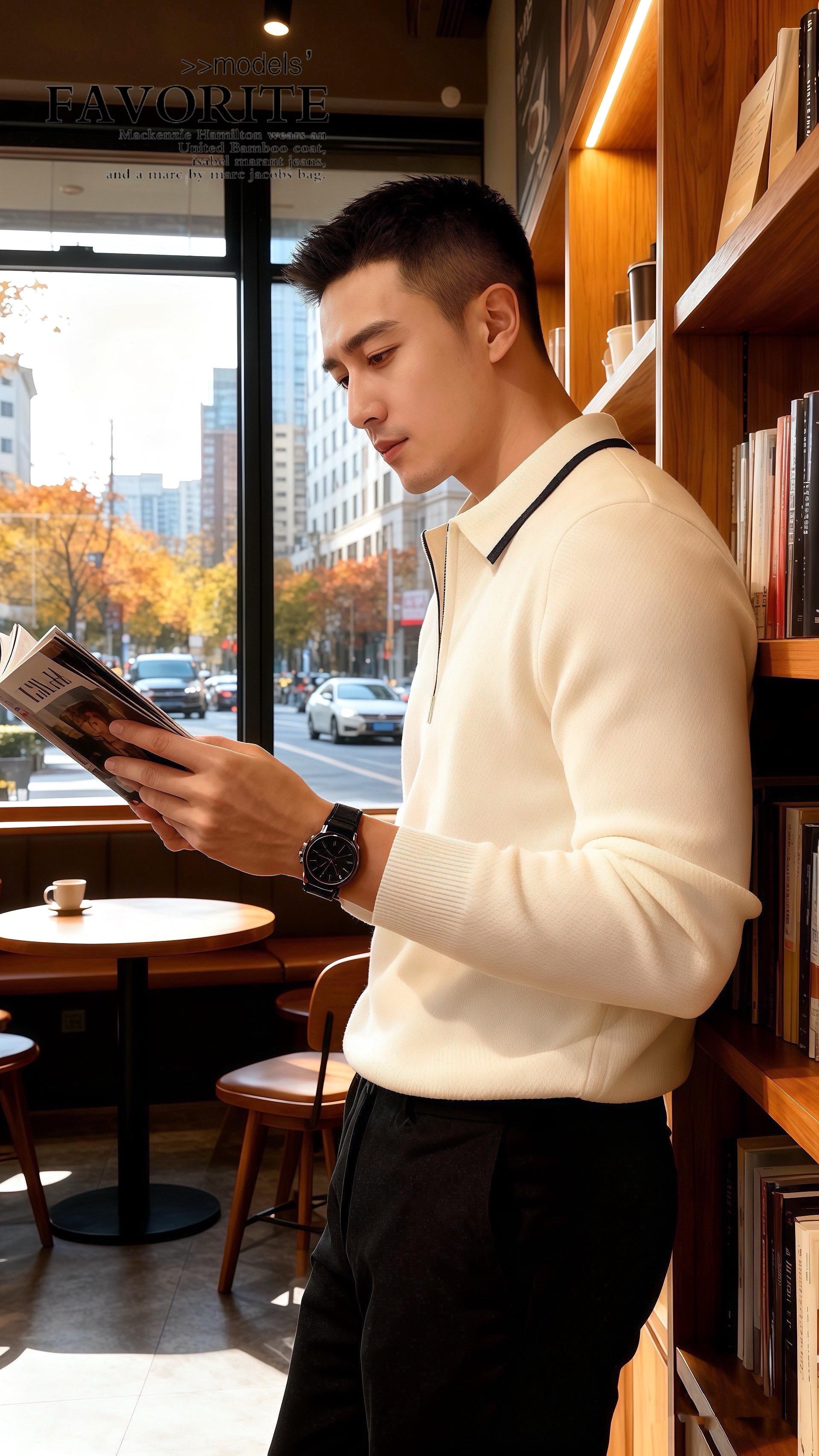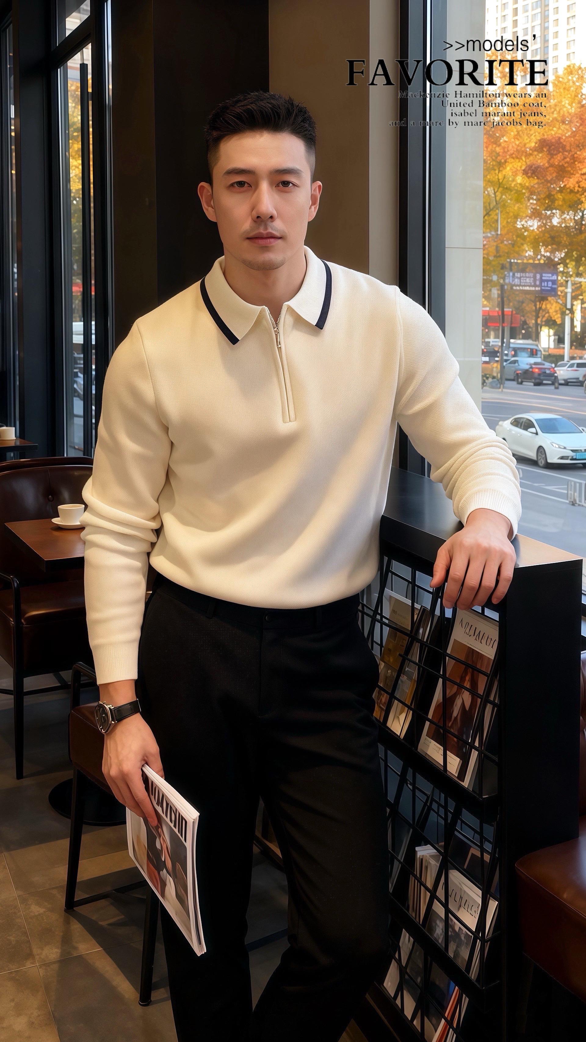 他穿米白针织衫,领口那圈墨黑滚边衬得肩线利落,配着垂感恰好的黑裤,像把秋阳揉进了松弛里。许妍走过去,指尖无意识蹭过他衣袖的纹理:“你今天……像把换季的风穿在了身上。”