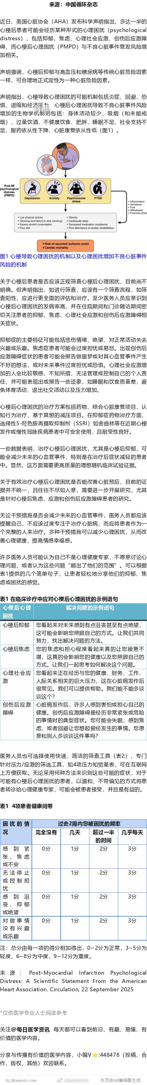 近日,美国心脏协会(AHA)发布科学声明指出,多达一半的心梗后患者可能会经历某种形式的心理困扰(psychological distress),包括抑郁、焦虑、心理社会应激、创伤后应激障碍,而心梗后心理困扰(PMPD)与不良心脏事件复发风险增加相关。