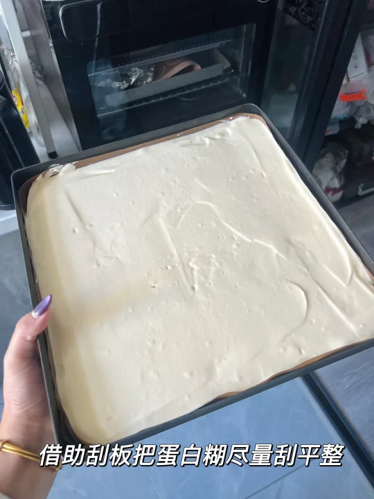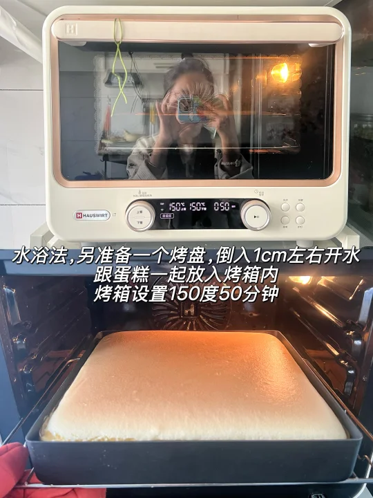 再就是需要用水浴法烤,烤蛋糕的同时烤箱内放一盘开水,烤出来的蛋糕更加湿润有弹性