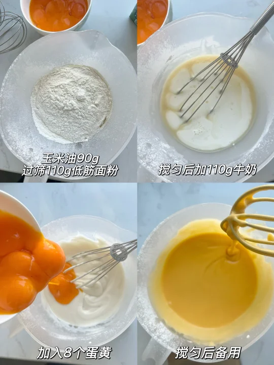 ✅食材:8个鸡蛋、细砂糖70g、牛奶110g、低筋面粉110g、玉米油90g、柠檬汁3g