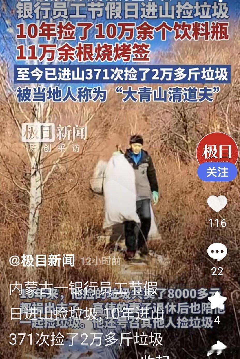 大青山清道夫来了,已捡了10万多个垃圾瓶子 有人上山连续十年捡垃圾 内蒙古呼和浩特中国银行的一名工作人员高伟 连续十年上山捡垃圾, 十年捡了十万多个饮料瓶 11万根烧烤签 至今进山371次 捡了2万多斤垃圾 被称为“大青山清道夫” 他呼吁人们要热爱并保护环境。后来他的妻子退休后也一起跟他捡。 10年来他们捡的垃圾都卖出去卖了8000多元,全部捐出去了 还给自己定了一个目标, 一年争取捡一万,他还号召其他人捡垃圾 我的天呐, 我在想 这山上怎么这么有这么多垃圾 为什么去上山游玩的人不及时带下山呢? 真是有人破坏环境,有人保护环境,这世道什么人都有。 无语…… 你们说这样平凡的公益人士值不得称赞呢 这是我看到极目新闻的报道 内蒙古公益活动