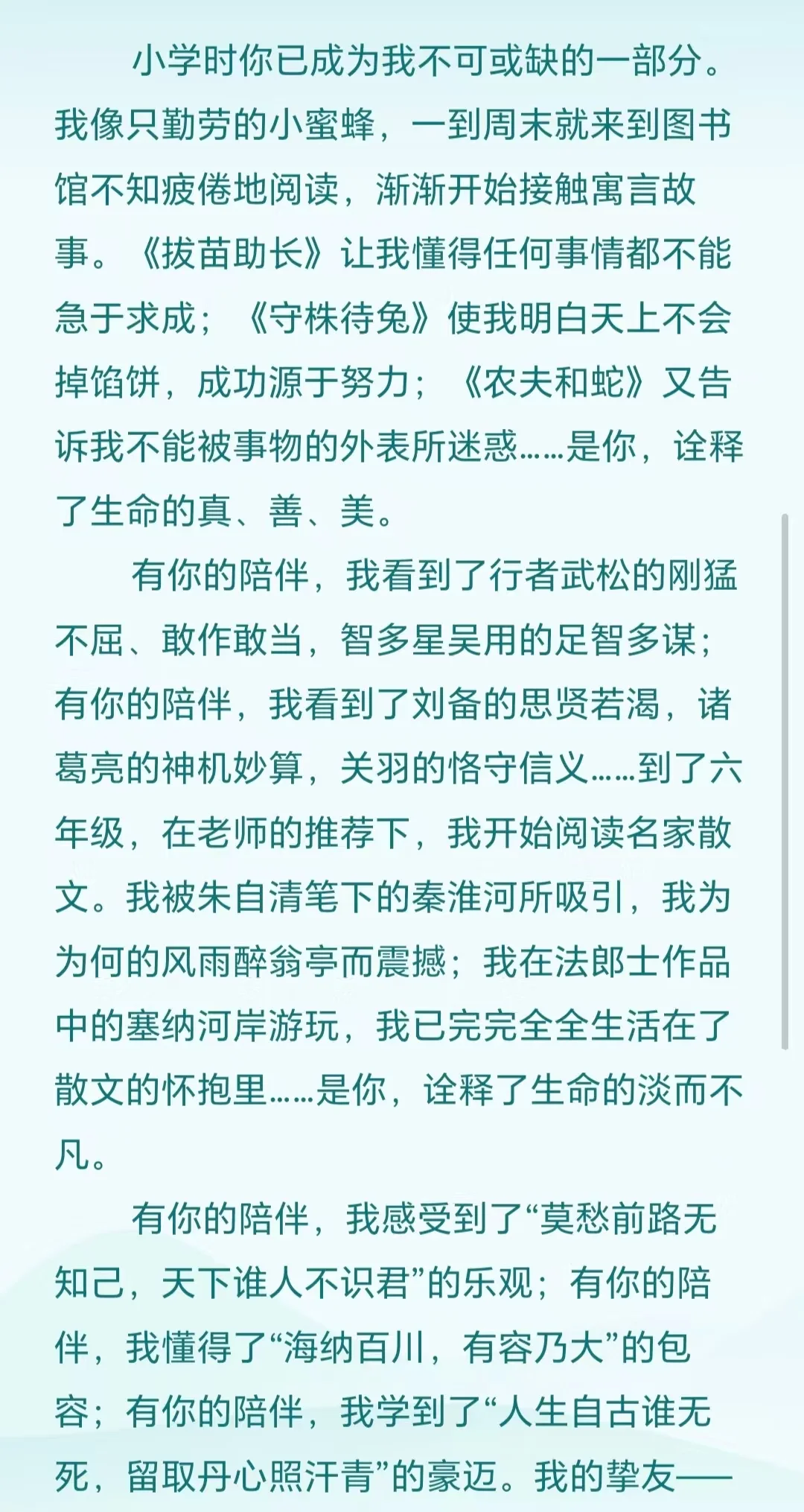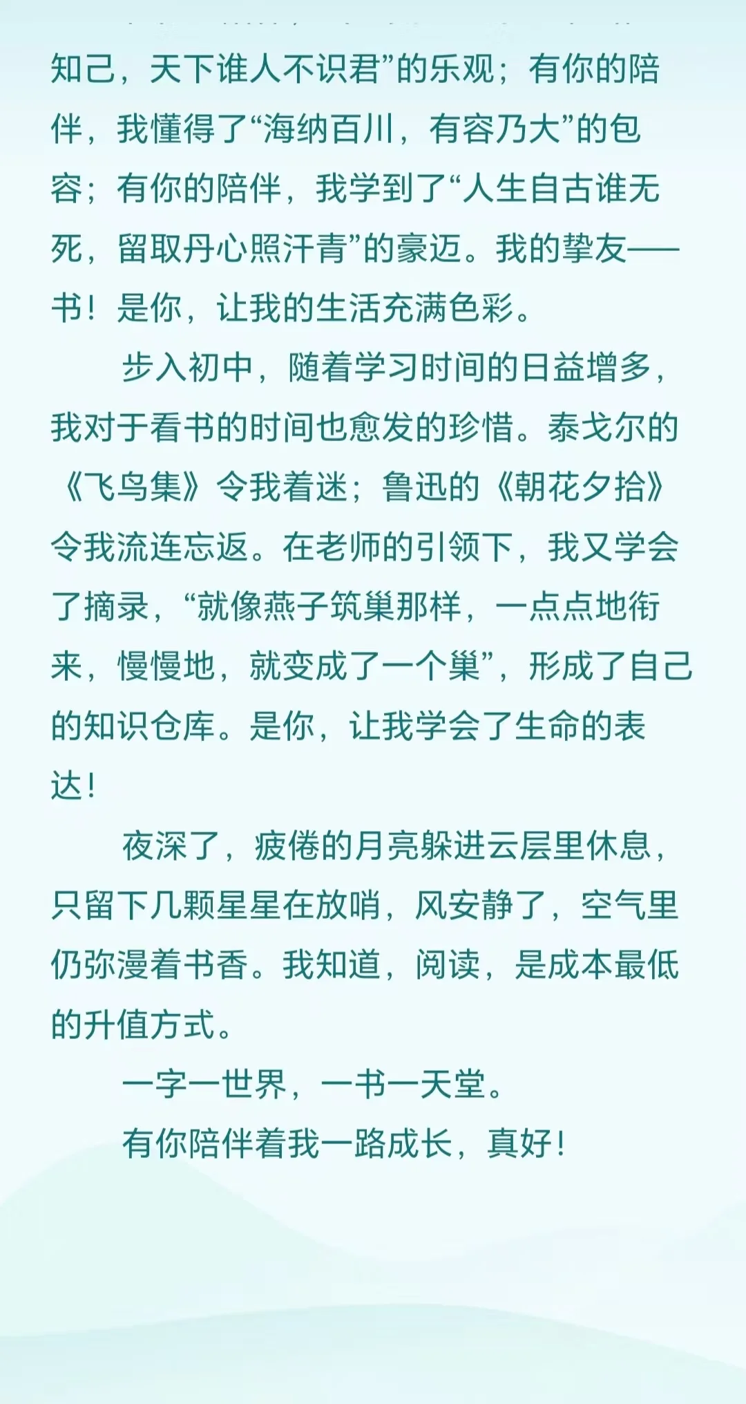 步入初中,随着学习时间的日益增多,我对于看书的时间也愈发的珍惜。泰戈尔的《飞鸟集》令我着迷;鲁迅的《朝花夕拾》令我流连忘返。在老师的引领下,我又学会了摘录,“就像燕子筑巢那样,一点点地衔来,慢慢地,就变成了一个巢”,形成了自己的知识仓库。是你,让我学会了生命的表达!夜深了,疲倦的月亮躲进云层里休息,只留下几颗星星在放哨,风安静了,空气里仍弥漫着书香。我知道,阅读,是成本最低的升值方式。一字一世界,一书一天堂。有你陪伴着我一路成长,真好!