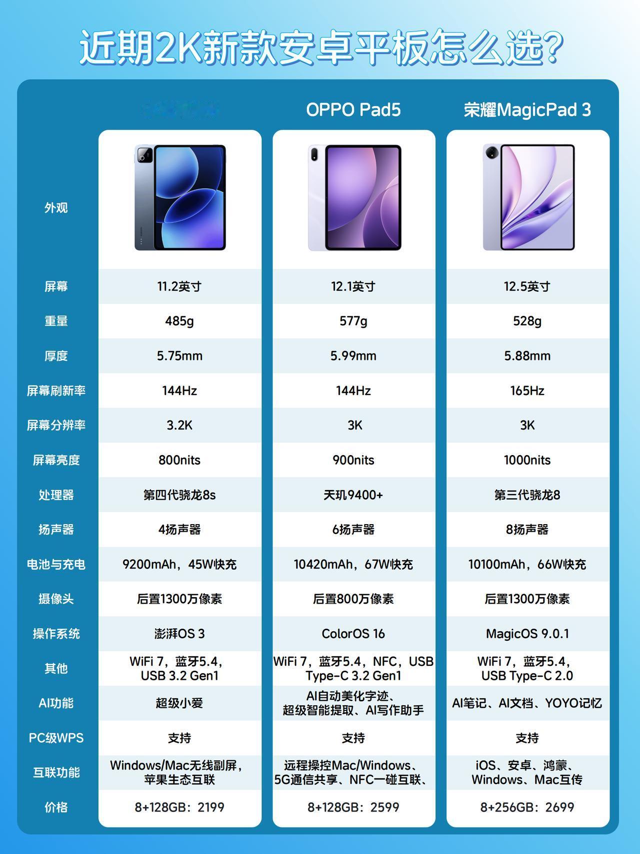 预算2-3千,国产高性价比安卓平板怎么选? 可能很多人说平板选iPad好,但对于爱打游戏的来说,有高刷屏幕且便宜不少的安卓平板才适合,毕竟带高刷的iPad Pro得五六千甚至八九千了,有点没必要了,那怎么选安卓平板? - 1️⃣小米平板8 骁龙8s Gen4 11.2英寸3.2K 144Hz LCD屏幕 9200mAh电池+45W快充 两千出头的价格在小米平板里比较不错的,处理器是去年次旗舰,日常够用也可以流畅运行王者和吃鸡等中低负载游戏,同时有PC版WPS、CAJ、CAD、浏览器等,还有分屏快切,生产力不错,适合学习和办公多一点的用户。 - 2️⃣OPPO Pad5 天玑9400+ 12.1英寸3K 144Hz LCD屏幕 10420mAh电池+67W快充 200万+跑分的顶级芯片,可以流畅运行多种高负载游戏,非常适合游戏党,5.99mm机身比较轻薄,有柔光屏版可选,磨砂屏幕写字舒适且屏幕不反光,加上PC级WPS、AI一键生成PPT、AI字迹优化等等,生产力出色,也适合许多学生党、考研党。 - 3️⃣荣耀平板Magic Pad3 12.5 骁龙8Gen3 12.5英寸3K165Hz LCD屏幕 10100mAh电池+66W快充 芯片属于第二梯队,性能上限不是很高,但也能运行原神等大型游戏,特别是165Hz适配了不少竞技类游戏,适合喜欢穿越火线之类游戏的用户,同时屏幕护眼比较出色,也有柔光屏版本,强光下也能看清。 - 总的来说,日用、游戏玩得比较少的可以看看以上的荣耀和小米,追求高性能的同时有学习、办公等需求的,更加建议看看性能更好的OPPO Pad5。 — 平板 安卓平板 平板电脑 OPPO平板 小米平板 荣耀平板 小米平板8 荣耀平板MagicPad3 OPPOPad5oppopad5OPPO平板孙颖莎同款OPPO平板OPPO双十一省心狂补节OPPO双十一安卓平板