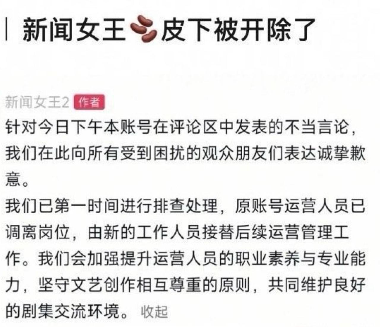 老实了吧,打工人皮了这一下,结果工作都丢了 新闻女来官方账号宣布,之前因为小编在评论区发表不当言论,于是宣布正式开除原账号运营人员,有后续新的工作人员接替工作 而事情的起因仅仅是有网友在新闻女王账号下留言说许我耀眼,想拍出来的感觉就是这样 然后新闻女王就回了一个不是一个赛道 我就想不明白,为什么说一句不是一个赛道会引发这么大的事情 很明显,这两部剧就不是一个赛道的呀 为什么要开除小编呢,是在阴阳怪气赵露思吗
