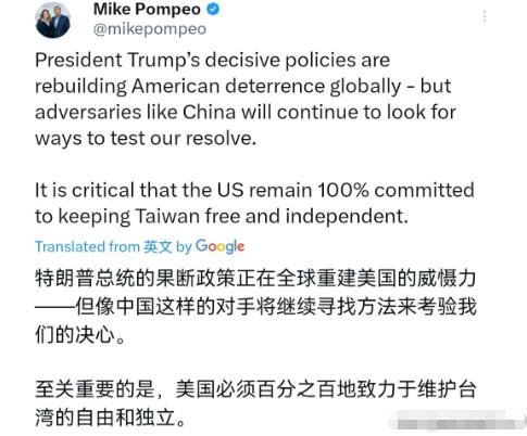 眼看中美将有可能在韩国举行高峰会,蓬佩奥跳出来大放厥词了! 10月29日,蓬佩奥放话声称,鉴于中国决心取代美国成为世界领导者并最终控制印太地区,重申美国对台湾的支持至关重要。美国必须向北京发出明确的信息:台湾是自由的,台湾是“独立”的——而且将保持这种状态。鉴于中国对台湾的意图如此明确,这种战略清晰度尤为重要。 眼下中美高层很可能在韩国碰面,外界都关注着两国的博弈。偏偏在这节点,蓬佩奥又出来刷存在感。这位前国务卿离开权力圈后,话说得越来越冲,把台湾问题当成了他谋取政治资本的工具。 蓬佩奥这番表演选的时机并不偶然,他清楚,只要台海局势被炒作,美国对华强硬派就不会安静,高层对话进程也会被搅得鸡飞狗跳。 他自己虽说已经不在位,却在热议话题上插上一脚,无非就是展示自己还“有分量”,给自己的政治利益添砖加瓦,甚至能从台湾“挣点外快”。 不过,蓬佩奥归根结底只是个失势政客,就拿特朗普来说,和日本高市早苗见面时,台湾话题只字未提,这并不是巧合。 像特朗普这样精于算计的人,太清楚台湾问题敏感得不能随便碰,真正掌握权力的人都明白,台湾是中美博弈的核心,轻率表态只会带来翻天覆地的后果。 蓬佩奥嘴上痛快,实际上完全代表不了美国高层主流,卸任后才敢说,说白了只能忽悠少数人,捞点小钱罢了。 况且台海局势早已不是过去那个剪不断理还乱的状态,从军力到动员,中国大陆这些年发展太快,两岸力量对比越来越明显,再怎么炒作,外部势力介入成本高得离谱。 美国真要帮台湾“撑腰”,付出的代价和风险只会越来越大,更别提能不能撑得住,精明的特朗普算个账,都能清楚意识到,插手台湾问题是比“赔本买卖”还让人头疼的买卖。 说到底,台湾问题是中国自己的事,是中国的核心利益,谁都改变不了,解决台湾问题,实现统一,是中国的国家战略目标,也是中国人民的共同期待。 像蓬佩奥这样的角色,今天吆喝两句,明天刷点流量,自欺欺人,对于中国的统一大势来说,根本翻不起什么浪花,中国的步伐决定着历史的方向。那些失意政客,只能在局外叫嚷几声。