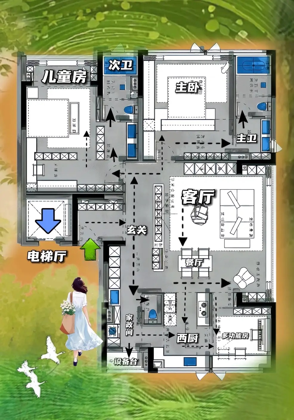 这格局不小了吧,多功能厅这个位置,本来就半死不活的,抓住开前后门机会,也是一条半隐形洄游动线,彻底解决开放式大客厅,闭环最后一步!