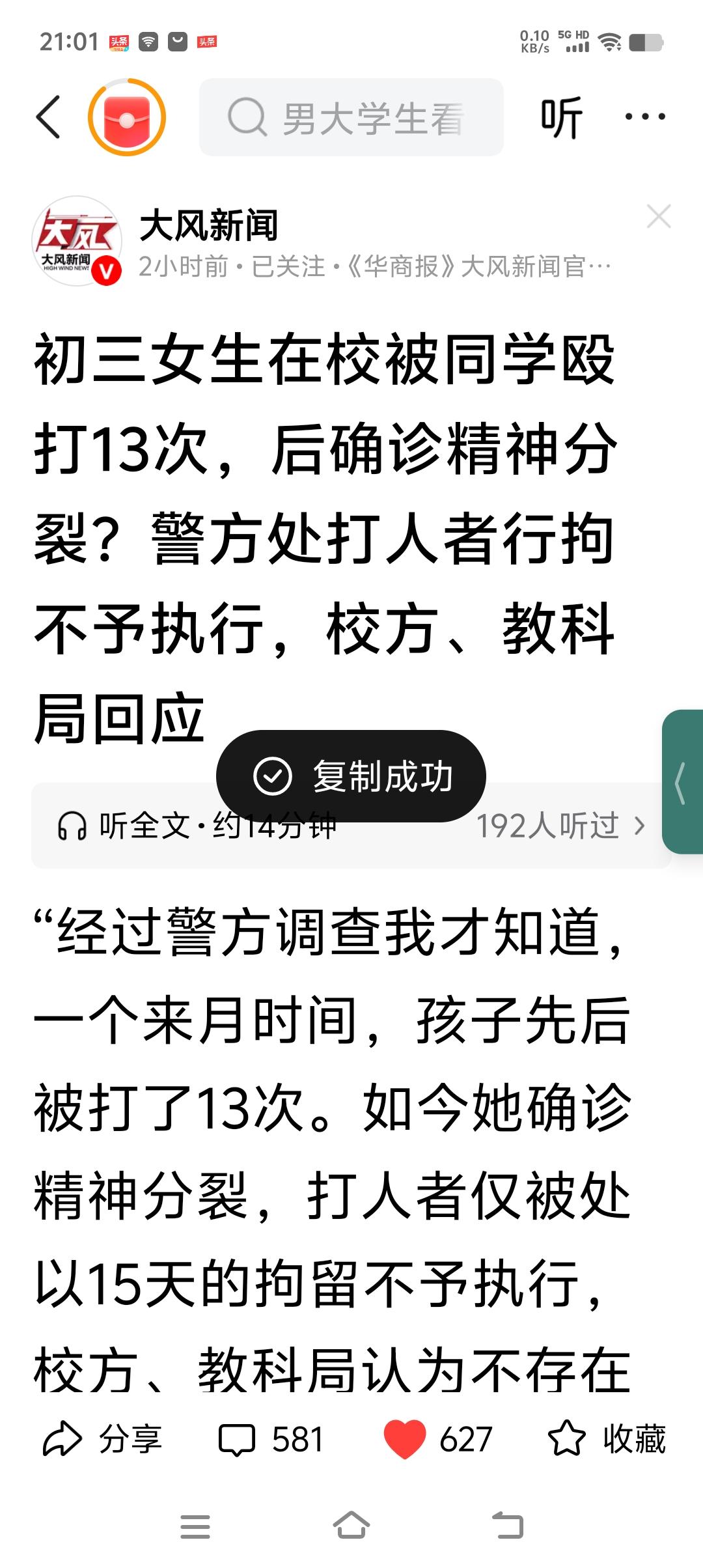 女孩被学生殴打13次,家长全然不知? 一个初三女生在校被同学殴打13次后精神出了问题! 这个女孩经常向家长要钱,30、20 家长也没问清原因,就直接给了,最后一次,女孩向小姨要600块钱,而且编造的理由也太牵强了,小姨发现不对,再加上看孩子表现不正常,才去学校找老师了解情况。 在观看录像的时候发现孩子13次被学生殴打,有一次他被学生打的时候,一位副校长从旁边路过并没有制止。 导致孩子经常被打,家长却蒙在鼓里! 1、家长对孩子每天上学情况,一定要过问、观察,发现孩子有异样的表现一定要问清原因,孩子在学校被打,回家一定会有所表现的,只是女孩家长没有注意观察! 2、孩子经常要钱不正常! 家长发现孩子经常要零花钱,一定要过问, 要跟家长说清楚, 也许这个女孩管家长要二三十零花钱,自己一分都没舍得花,全部给同学了,家长还认为孩子是自己花了,所以作为家长给孩子钱后,一定要孩子说清钱的去向,如果购物了,要把物件让家长看到! 3、一个学生在班级里经常被另一个学生殴打老师竟然没发现! 也许这个女生学习不怎么好,是被老师和同学们忽略的那种,经常打他的学生也认为一次两次家里都没有管,从而变本加厉! 4、家长要教育孩子在学校受到不公平待遇的时候,如果自己解决不了,一定自己要与家长沟通。 这孩子别人管你要钱,为什么不跟家长说, 哪怕说出一次也不会有第二次,第三次! 作为老师应该多关注一那些弱势的孩子, 也就是那些不擅言辞特别老实的孩子,发现这些孩子被欺负的时候,老师一定要为这样的孩子撑腰,绝对不允许那些狂妄自大的孩子飞扬跋扈, 即便你学习再好,家庭条件再优渥,作为老师应该公平对待,他们不应该欺负那些家境一般学习一般甚至学习差的孩子,学生学习成绩好坏参差不齐,但是绝对不能允许,因为成绩好就欺负学习差的学生!