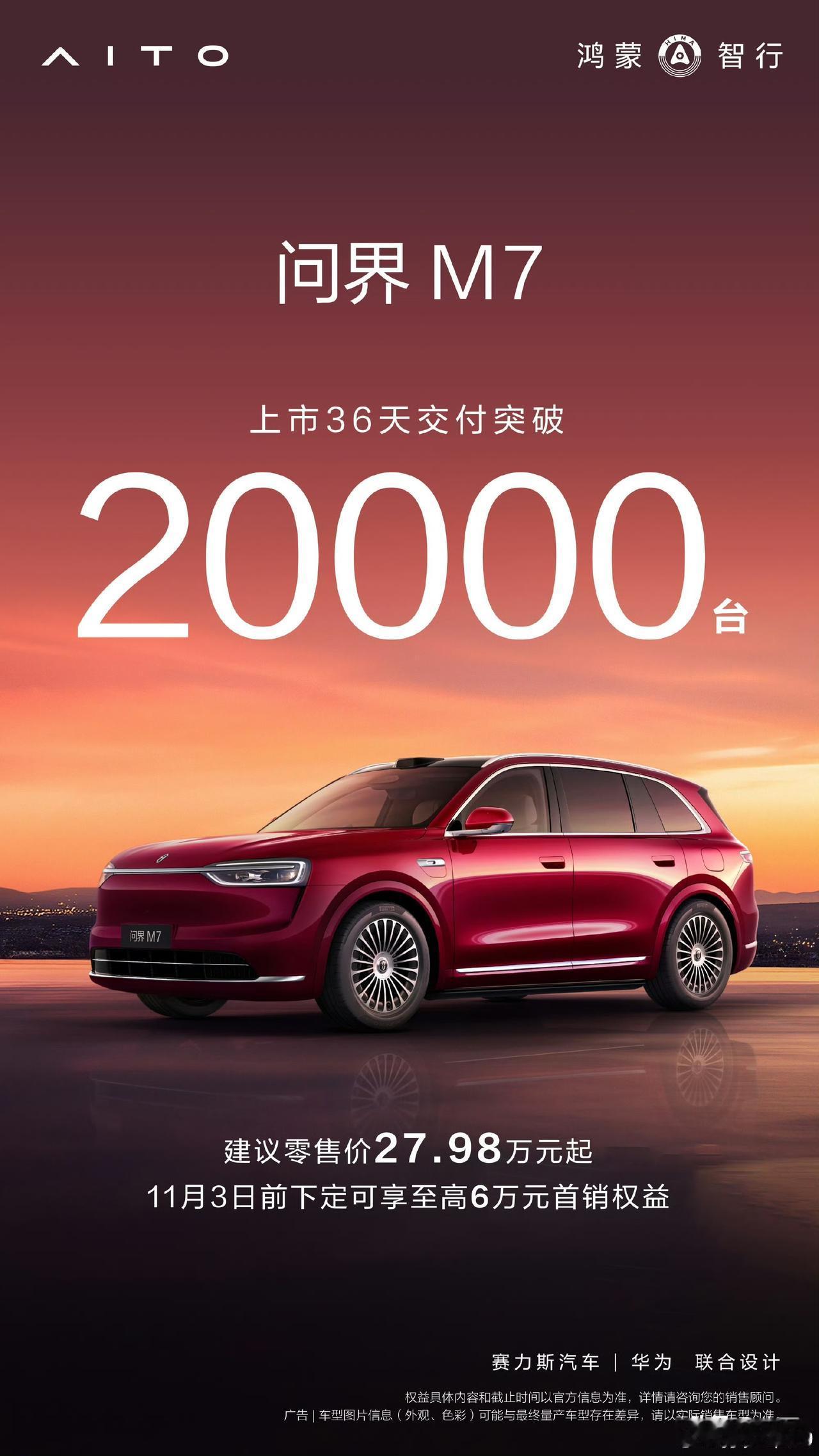 孙少军:全新问界M7上市36天,累计交付破2万台! 现在这款车就像他这个颜色一样,完全就是一个网红车了,前段时间卖得那么好,很多人都在盯着,他每个月到底能够交出去多少? 因为卖出去的,其实在某种程度上的时候只不过是个数字和金额,而真正能够表现这个汽车企业综合实力的,还得是他制造汽车的能力! 就说现在已经卖出去几十万台了,但它都是数字,不是真正的实车,所以那些已经下了订单翘首以盼的用户,都在时时刻刻刷新自己的App! 因为你花了几十万,买了一个东西,如果一年半载都看不到货的话,估计谁心里面也不好受,所以这个时候相对来说有点压力的,反而是车企,谁能够在尽可能短的时间里,把这个车交到用户手上,谁才掌握了市场的主动权。 这款车从出来,到卖,一直都刷新了问界系列,来自于30多万这个空间所有汽车品牌的一个记录,但是对于真正花了真金白银拿钱买这个车的用户来说,他们家关心的是:我的车什么时候能够到手。 所以他那个在30多天的时间里面,生产出20,000台车出来,看样子应该是尽力了,不知道这个成绩在行业里面怎么样?