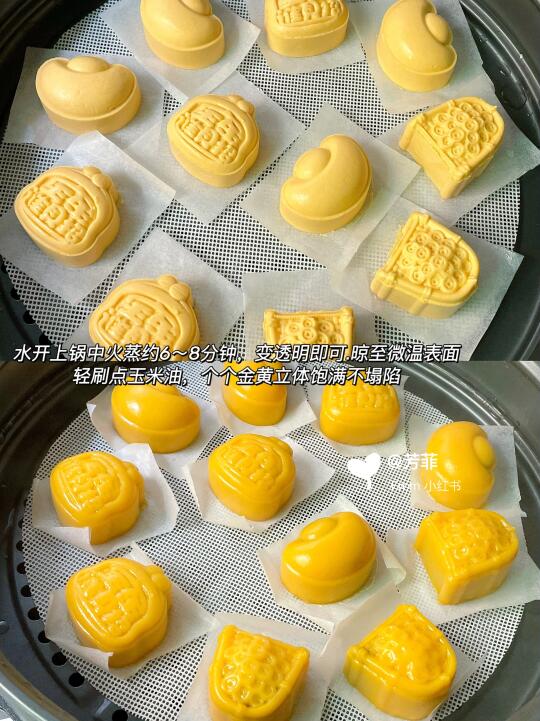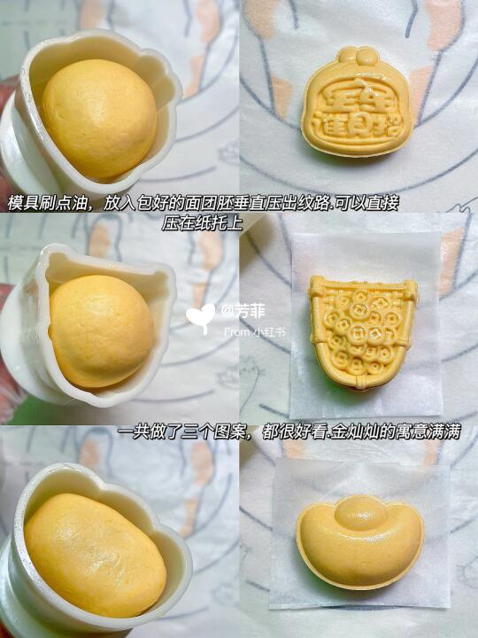 3️⃣面团压扁包入馅料收拢滚圆,模具轻刷点油放入包好的面团,垂直轻压到油纸托上.水开上锅转中火蒸6分钟左右,变透明即可.温热时表面轻刷点玉米油保湿,冷却后需密封