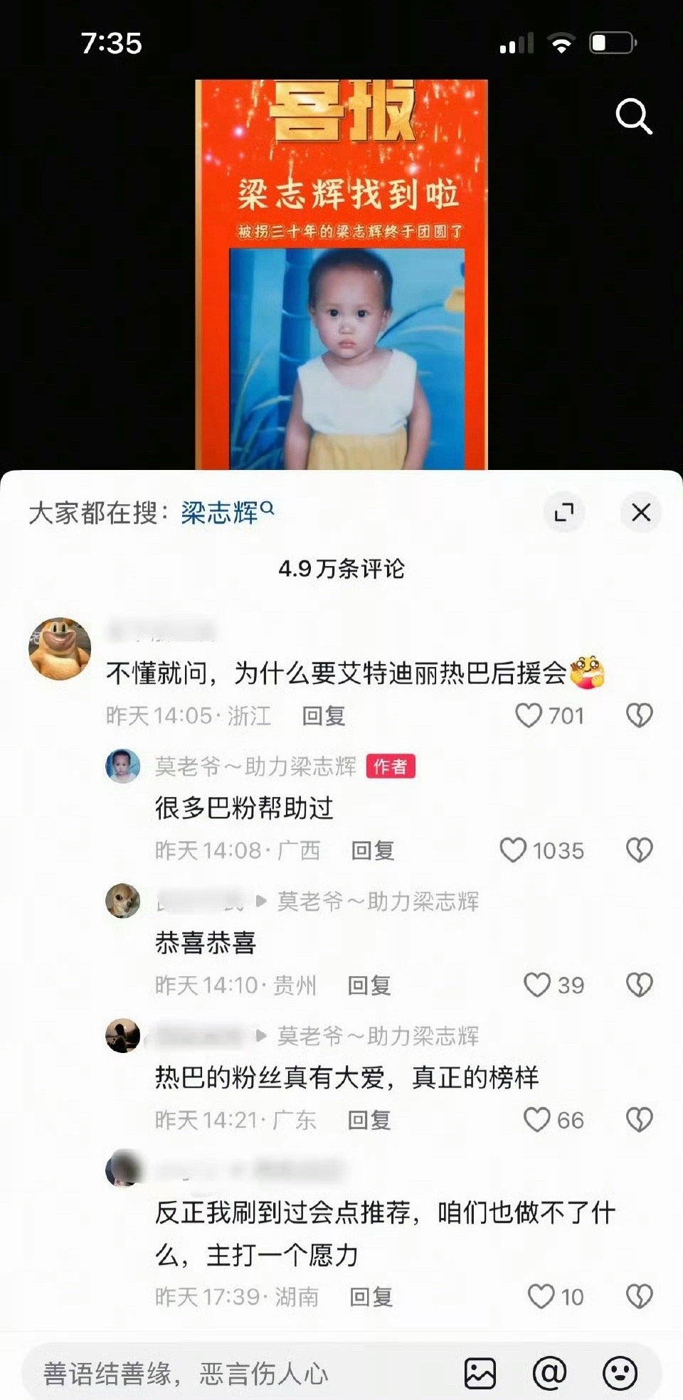 被拐三十年的梁志辉终于找到了,并且艾特热巴后援会感谢🥹