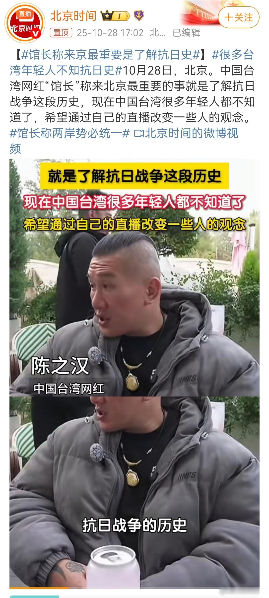 中国台湾网红“馆长”称来北京最重要的事就是了解抗日战争这段历史,现在中国台湾很多年轻人都不知道了,希望通过自己的直播改变一些人的观念。