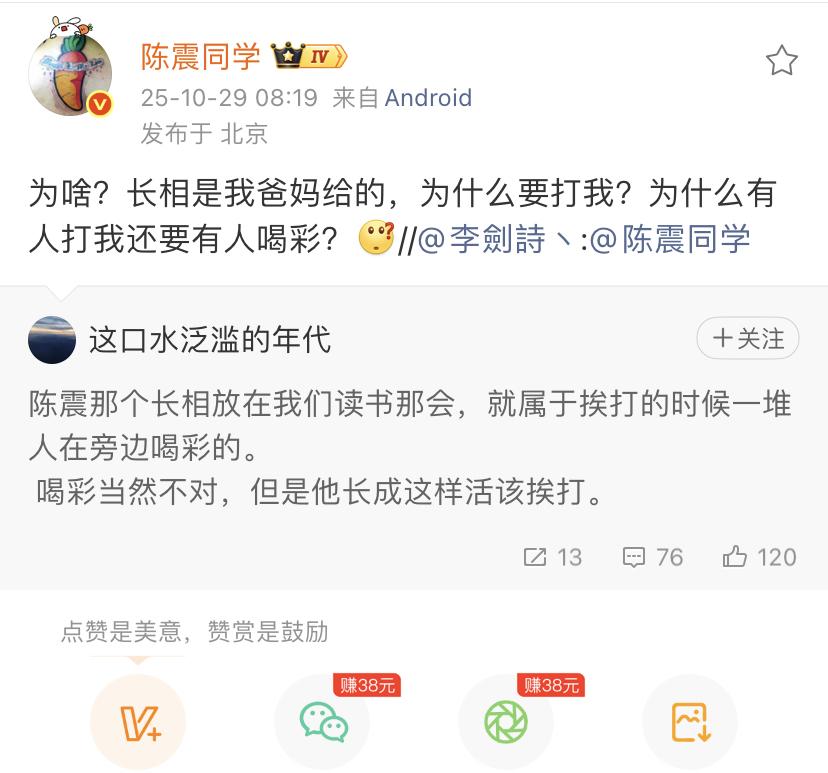 陈震:为啥?长相是我爸妈给的,为什么要打我?为什么有人打我还要有人喝彩?[what] 这些网友也非常的有意思,没有话题的时候就会到陈震去调侃,只要不是太过激的言论,一般都不会拉黑。 网络玩多了,也就发现网友们的多样性真的是非常的多,每个人的想法真的有非常大的不同。