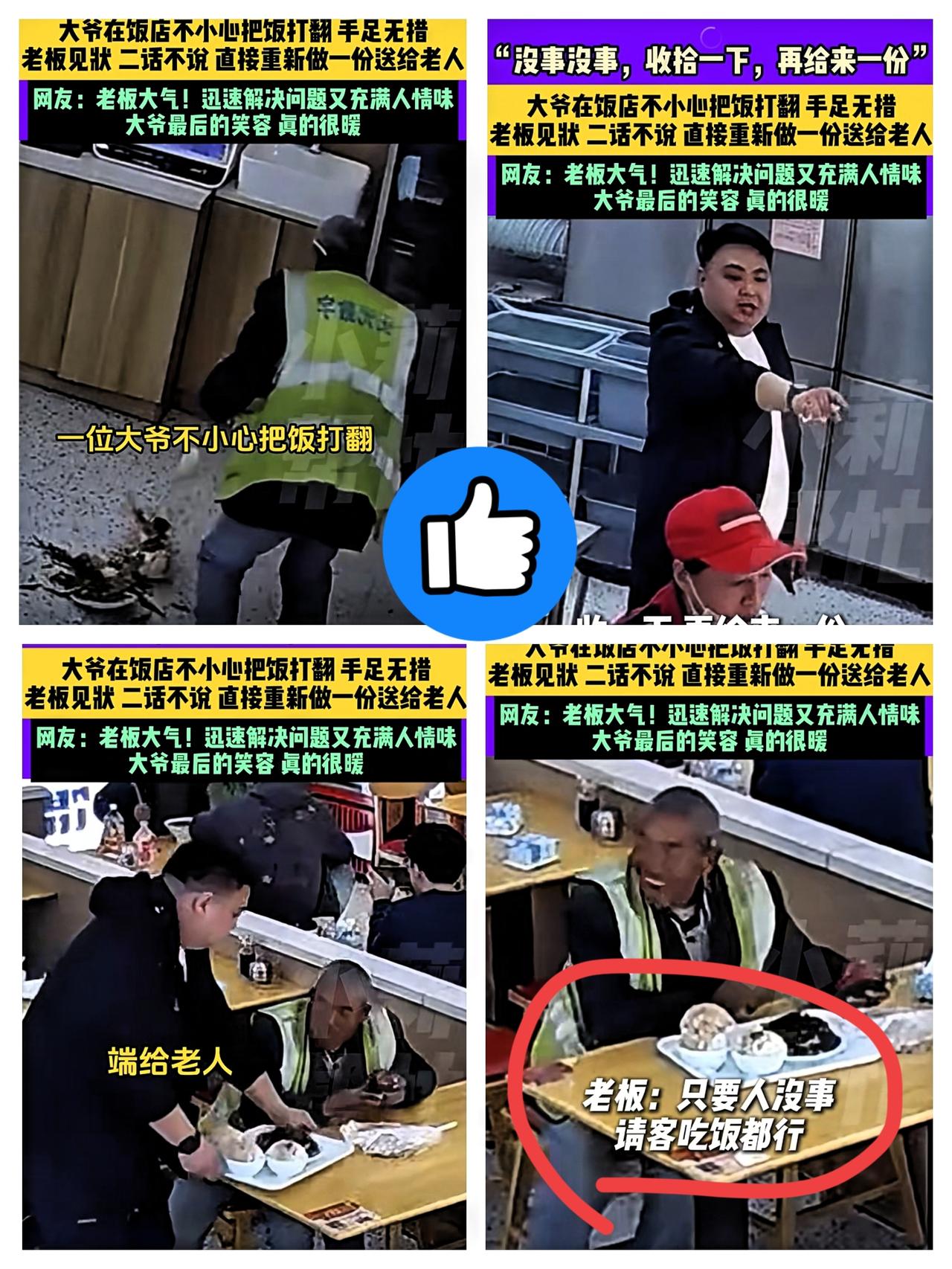 全国人民都知道了 大爷在饭店不小心把饭打翻了 手足无措站那儿,结果老板 眼睛都没眨,直接喊“再做一份”——这哪是做生意啊,这是把“人情味”揣进了菜盘子里! 别觉得这是小事,现在多少人遇着事儿先算得失,可这位老板偏不,他先看见的是“大爷慌了”,不是“饭洒了”。其实咱们要的哪是免费的饭啊?是那份“你别怕,我罩着你”的踏实! 真希望这种老板能扎堆开饭馆!你说要是咱们出门都能碰着这事儿,日子得甜成啥样?你们遇过这么暖的老板不?来评论区晒晒!