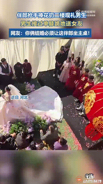 河北一对新人结婚,新娘抛捧花的时候,一名伴郎非常积极地准备抢捧花,所有宾客都以为伴郎是有对象了,谁料伴郎抢到捧花后,居然直接把捧花扔到了二楼的一名男子手里,随即男子也是立即单膝跪地,把捧花送给了自己的女朋友。 网友看完这一幕,都觉得这个伴郎真是值得深交的好兄弟啊,他自己还没有女朋友,却为了兄弟那么积极地抢捧花,而且一抢到捧花就立即扔给了兄弟,丝毫不拖泥带水,可见他对兄弟是真的好,希望兄弟能够尽快获得幸福,不得不说,他的举动真是神助攻啊。大家怎么看呢?