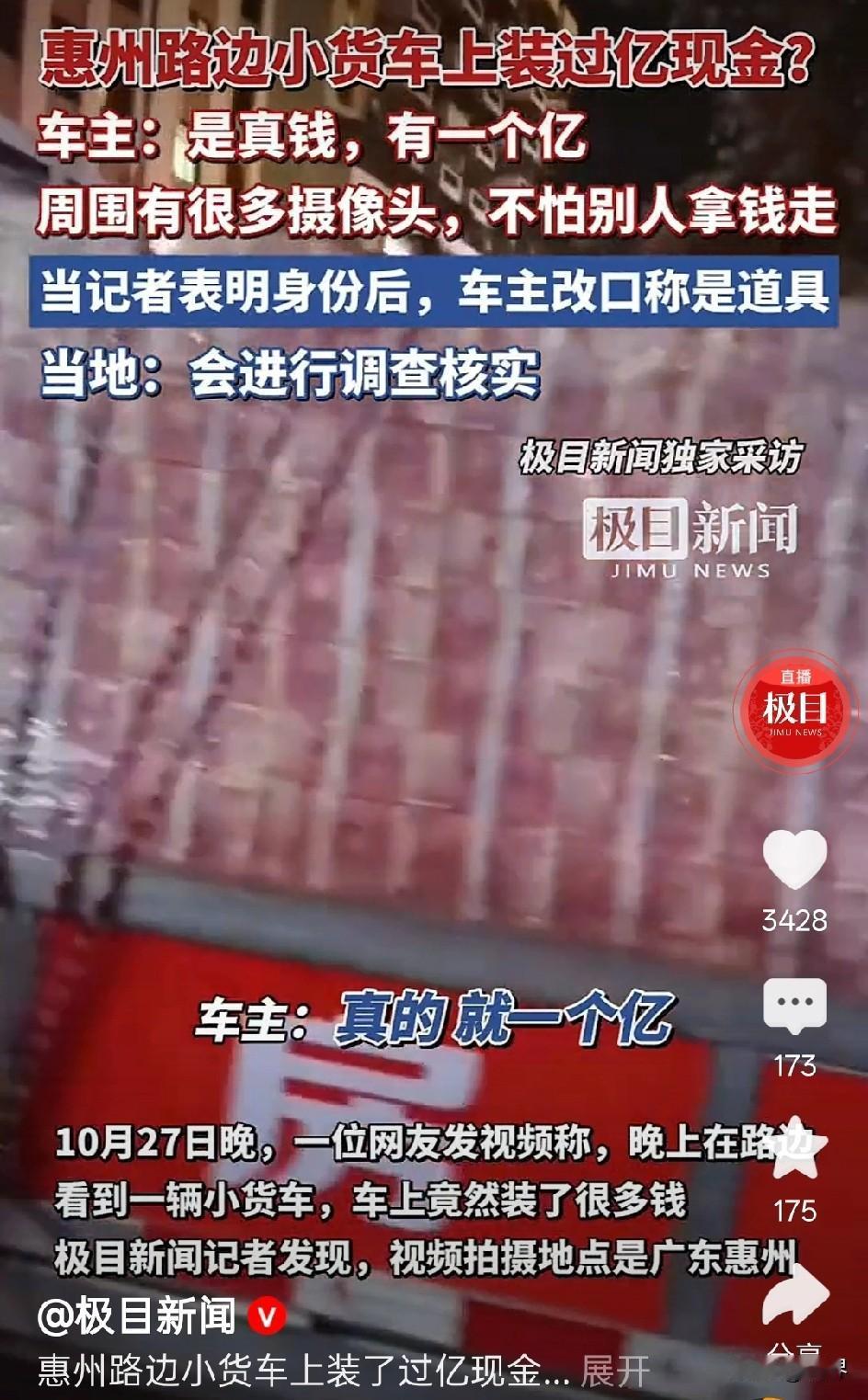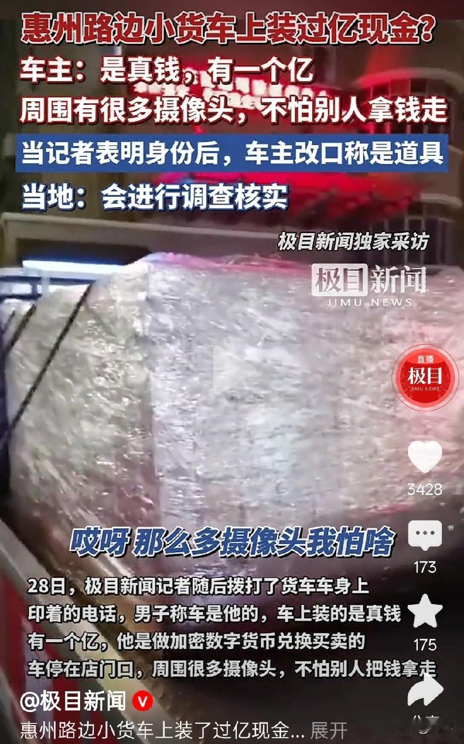 这又是哪位土豪,一个亿的现金啊! 敢用小货车装着招摇过市,建议相关部门尽快查一查是不是涉诈资金?我上坟都不敢这么烧,他竟敢如此轻蔑。 事情是这样的,广东惠州,一辆小货车载着一车整整齐齐的现金出现在闹市,外面仅用保鲜膜作简单的防护处理,车厢两侧还贴着“私房钱”三个字。 当记者以普通群众身份,询问车主怎敢如此运输,不怕被抢吗? 车主竟回答,这足足有一个亿的现金,这里到处都是监控视频,完全不用担心。 当记者向车主表示记者身份后,车主却马上改口称是练功券。 视频一经发出,眼尖的网友认为这不是练功券,很可能是真钱。为了搞清楚这一情况,大家一致要求相关部门尽快查清!