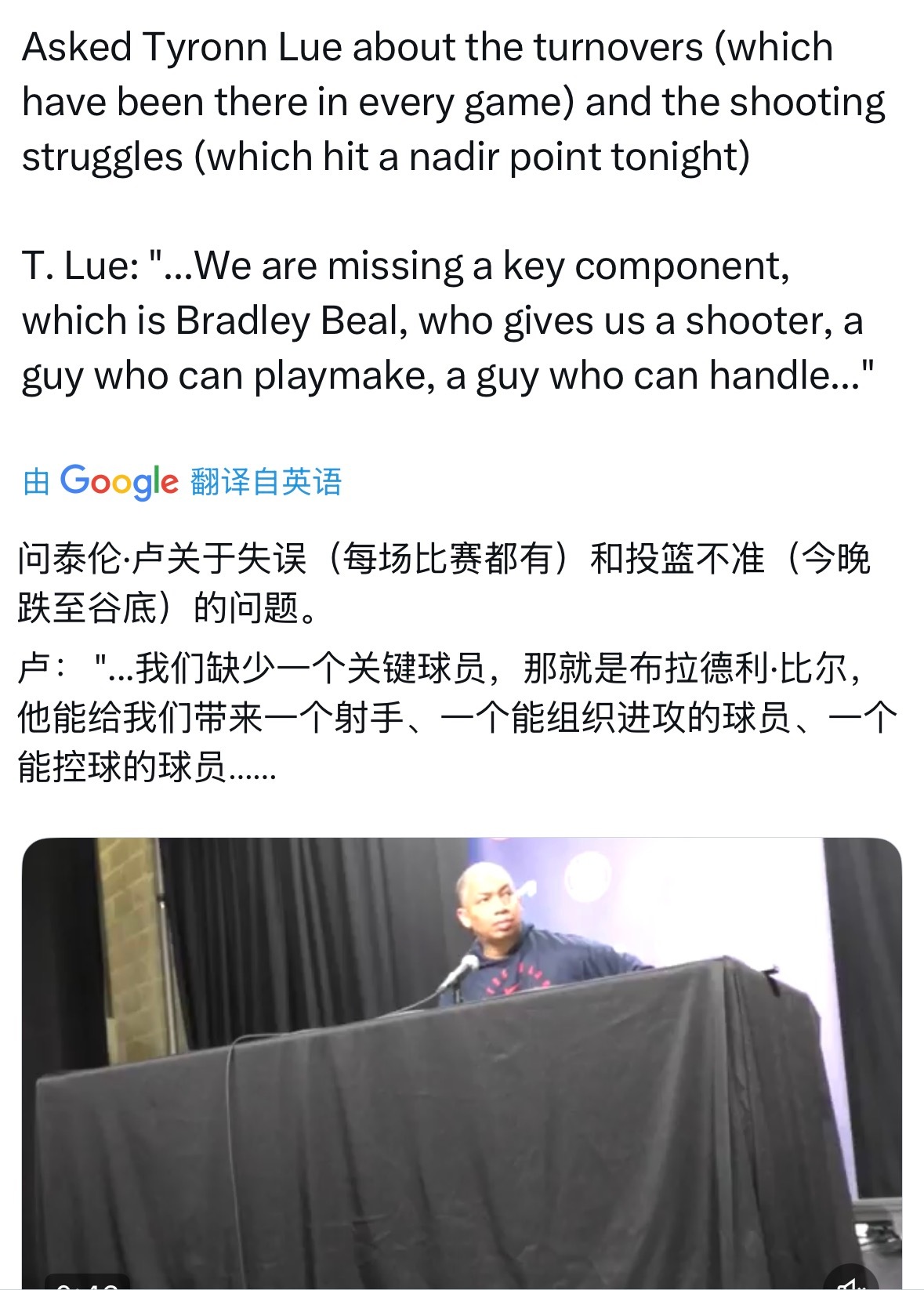 卢: "我们缺少一个关键球员,那就是布拉德利·比尔,他能给我们带来一个射手、一个能组织进攻的球员、一个能控球的球员…