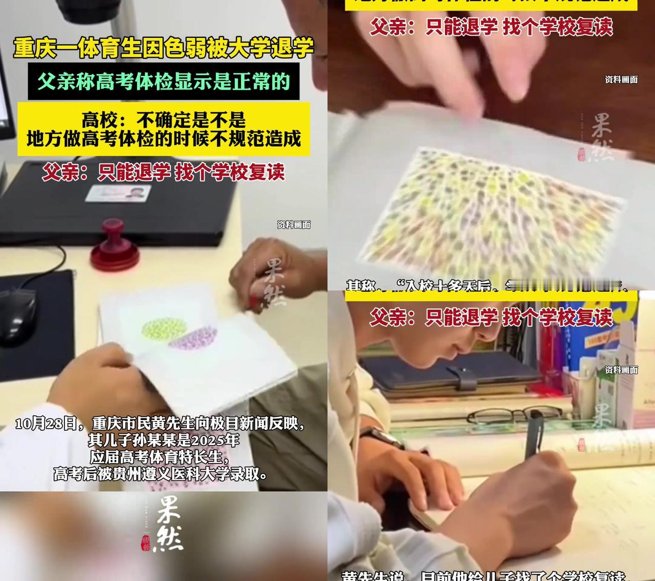 体育生色弱居然被退学?我还以为只有美术生要查这个! 重庆的孙同学是体育特长生,今年考进遵义医科大学,入学十多天复查出色弱,这专业明确不收色弱,但他高考体检是正常的。 现在只能退学复读,可孩子高考后打工旅游,知识忘光了,现在学不进去。 有人说肯定是改了体检(朋友教练走关系盖的章),有人说医学必须严(做手术分不清动脉静脉),还有人说该转专业(兰州理工大学就给转了)。 我就想,规则是死的,人情能不能活点?本来能转专业的事,直接退学太让人难受了。 大家觉得最该怪谁?是改体检的侥幸,还是学校处理太急?