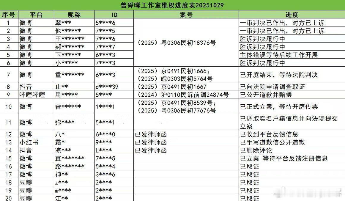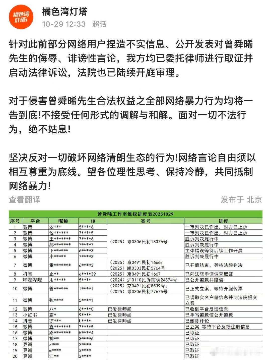 曾舜晞全平台告黑维权进度曾舜晞方公布告黑进展 10月29日,方公布全平台告黑维权进度“针对此前部分网络用户捏造不实信息、公开发表对曾舜晞先生的侮辱、诽谤性言论,我方均已委托律师进行取证并启动法律诉讼,法院也已陆续开庭审理。